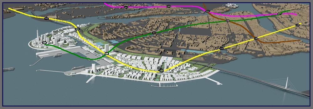Синия линия, это что за фантазия? И куда и откуда идёт? НВЛ на север гнать не рекомендую, так как там уже ЗЗЛ и ФПЛ, куда НВЛ пихать собираетесь? По этой схеме можно только сделать угол западнее Приморской, пересадку между НВЛ и ЗЗЛ (там где сейчас остров заканчивается), плюс добавочную станцию НВЛ ещё западнее (уже на намыве).