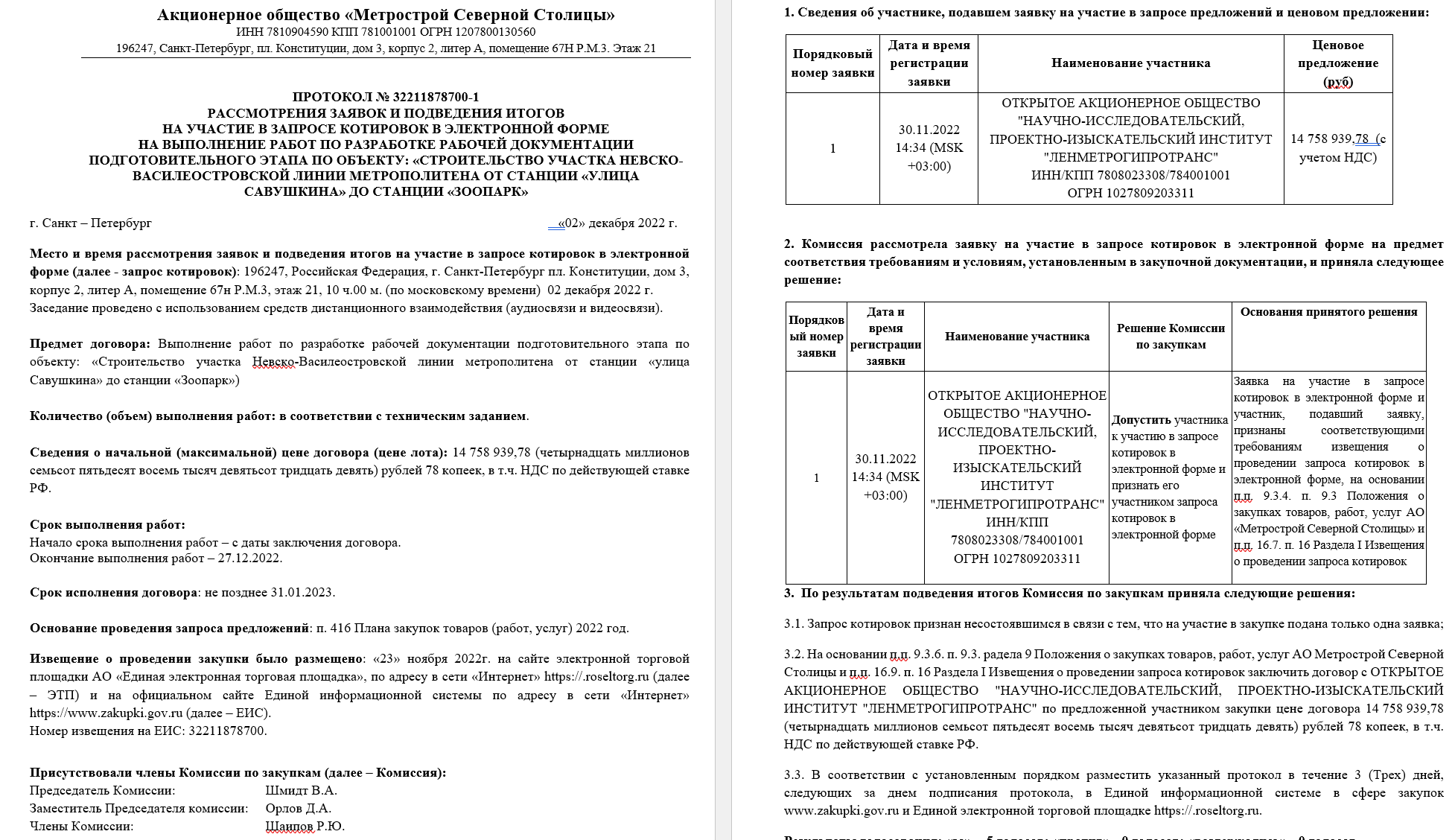 По разработке рабочей документации подготовительного этапа по объекту: «Строительство участка Невско-Василеостровской линии метрополитена от станции «улица Савушкина» до станции «Зоопарк» подал заявку Ленметрогипротранс, но закупка признана несостоявшийся