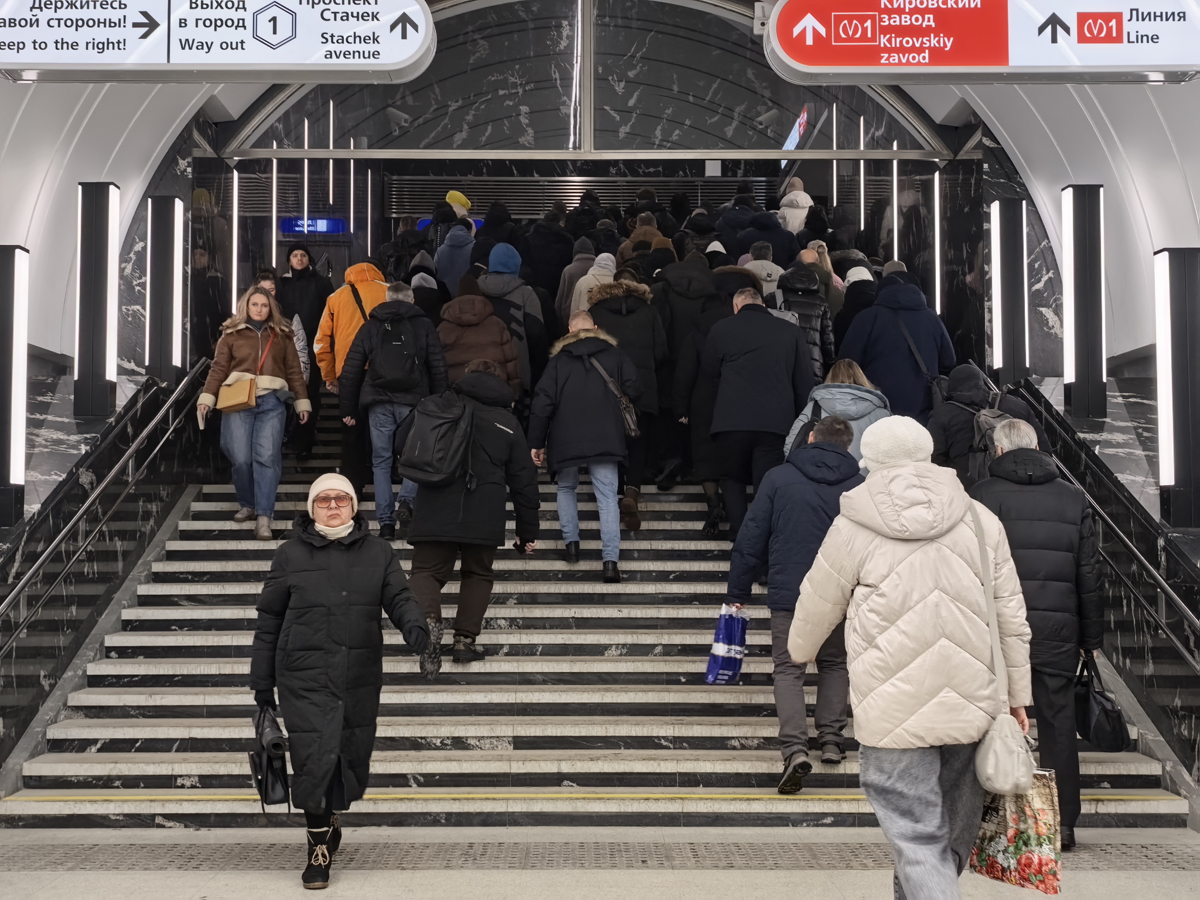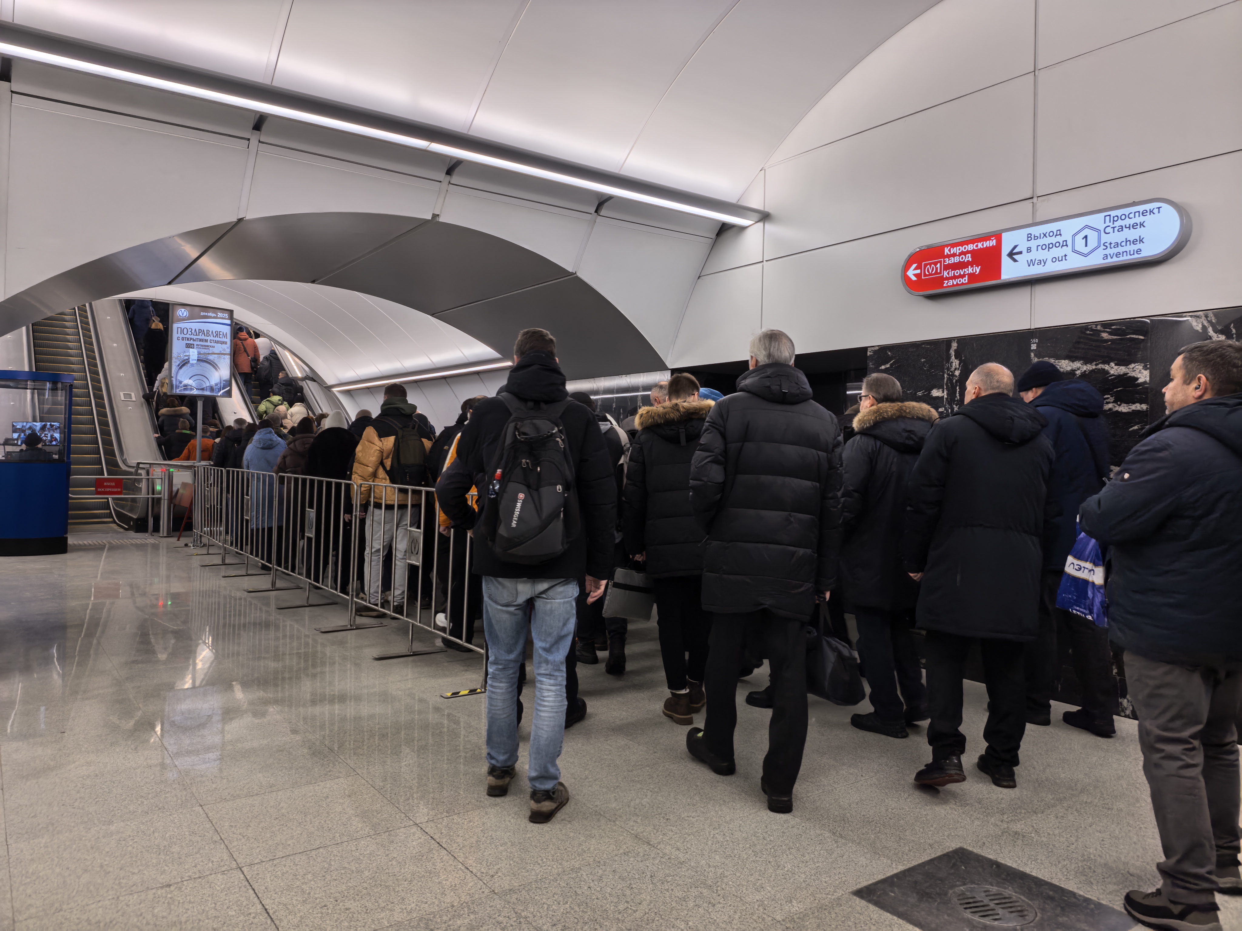 Сегодняшний пассажиропоток в утренний час-пик, в 8 утра. Было ожидаемо, что такой узкий пересадочный узел даст о себе знать. Перед лестничным маршем столпотворение и перед эскалаторами. Страшно представить, когда будет ремонт наклонного хода станции «Кировский завод».