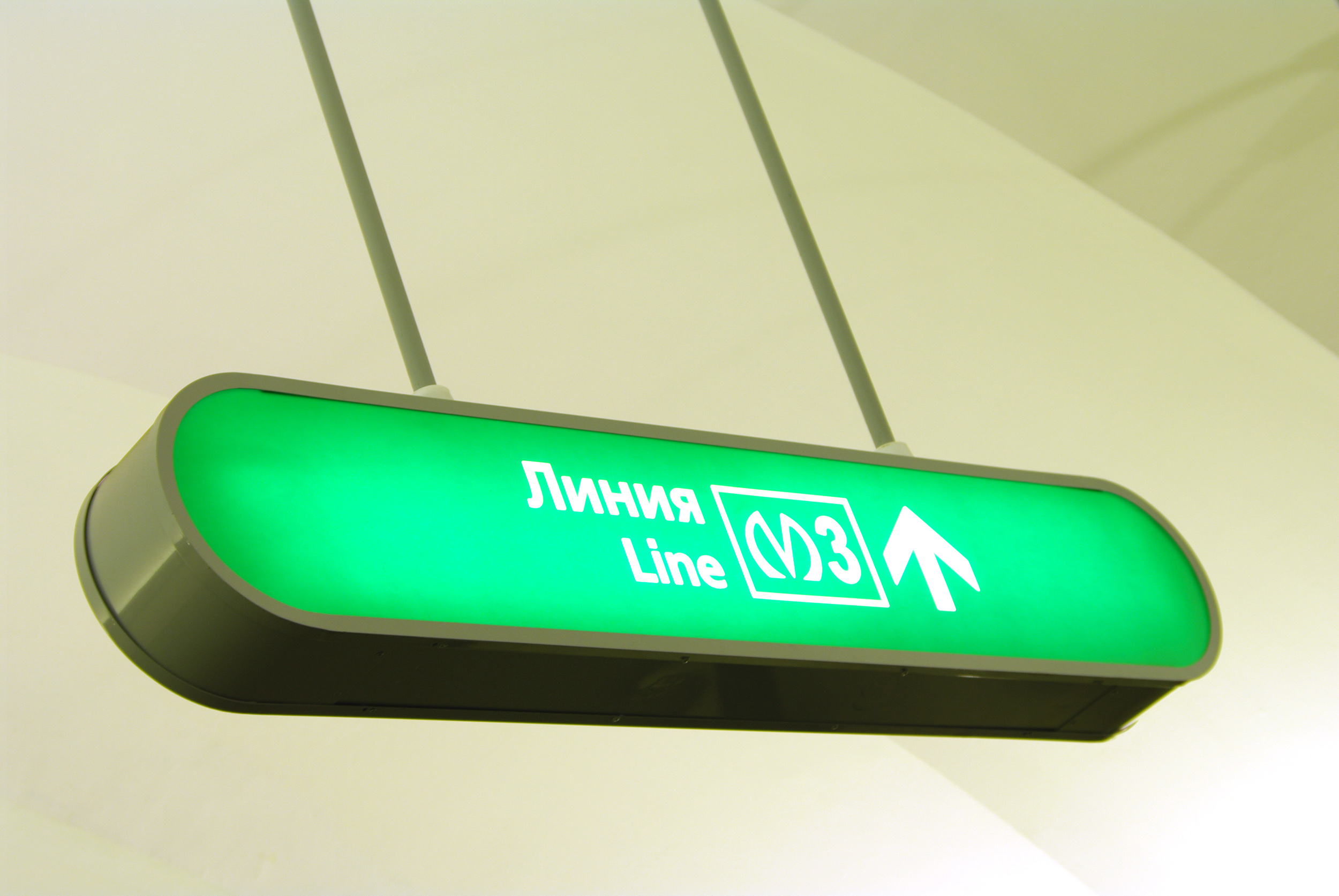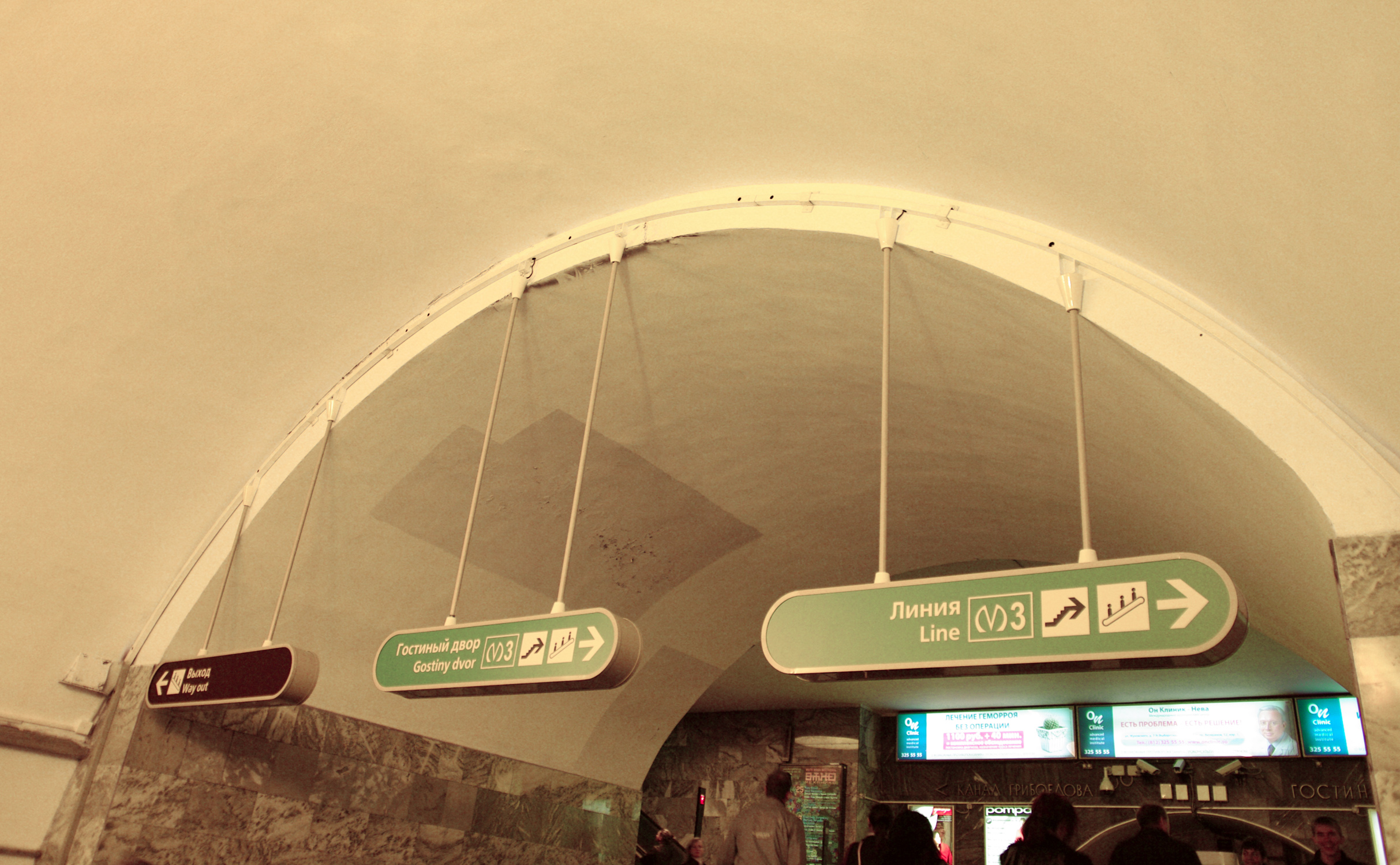 Да, на самом деле указателей не так уж много. Один на подъёме с малых эскалаторов, один посередине, затем две пары у спусков на Невский и один ближе к концу, ну и один при спуске на Невский по эскалаторам.