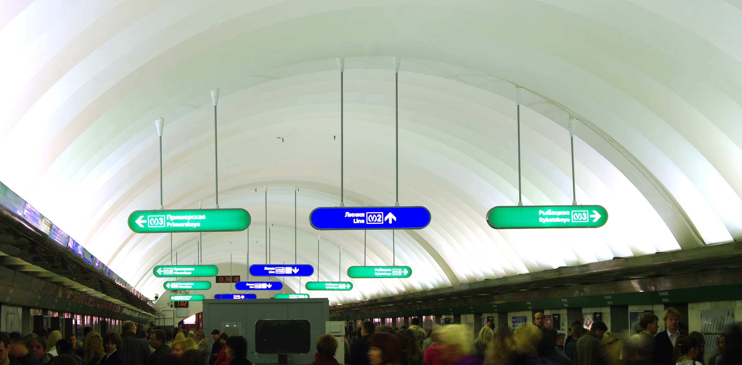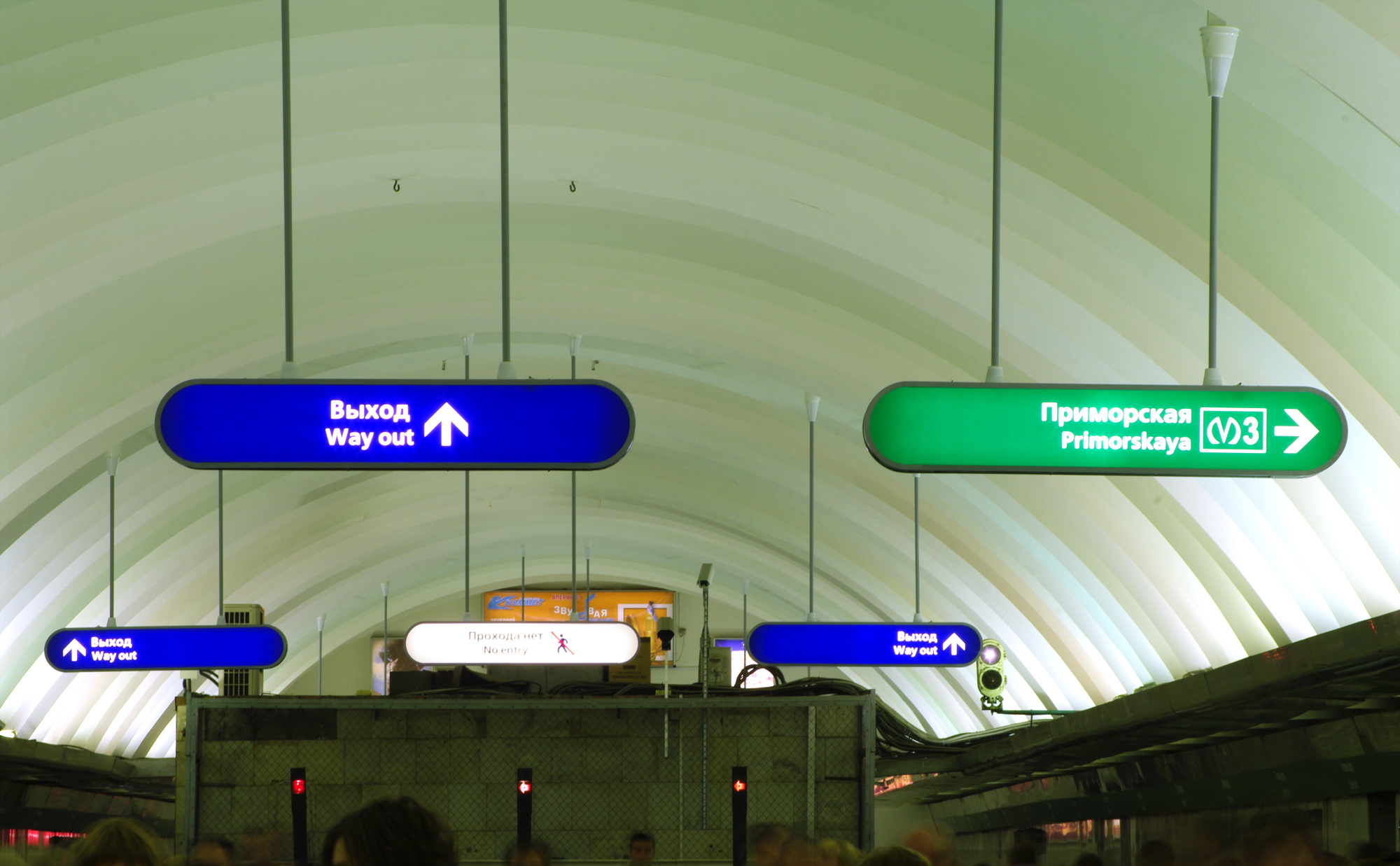 Пользуюсь этим пересадочным узлом не часто, поэтому эти информационные указатели мне сегодня очень помогли при выходе из вагона на Невском пр. Жаль только повесили их не на всех арках, а через одну. Вот честно, МИНИМУМ информации это то что надо! На прочтение указателей с мелким шрифтом в которых написано одно-два предложения нет ни времени ни желания, здесь с помощью значков и цветов всё понятно, и смотрится красиво.