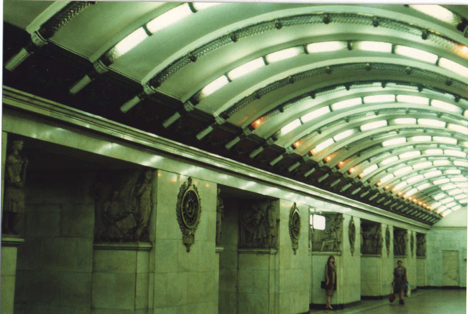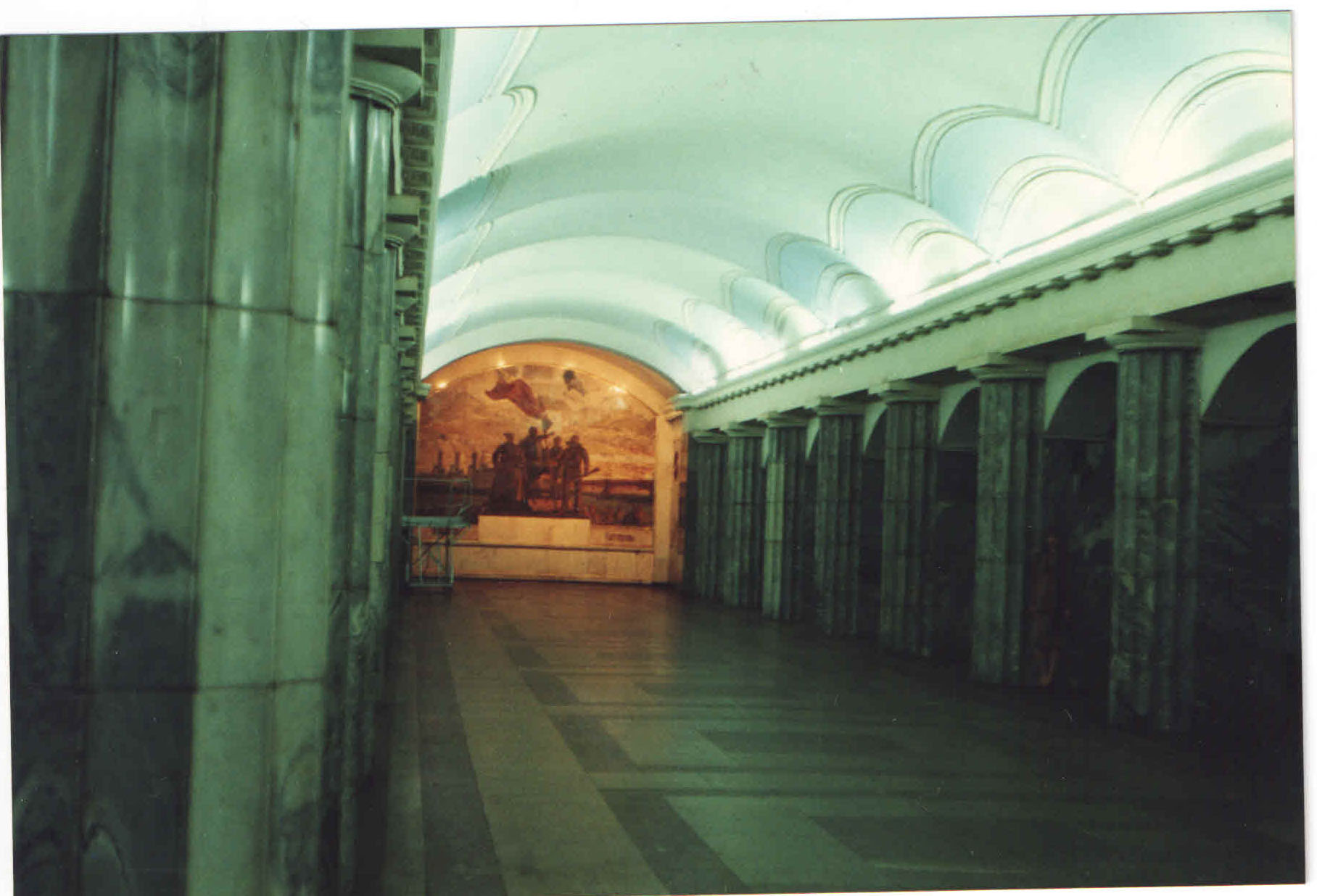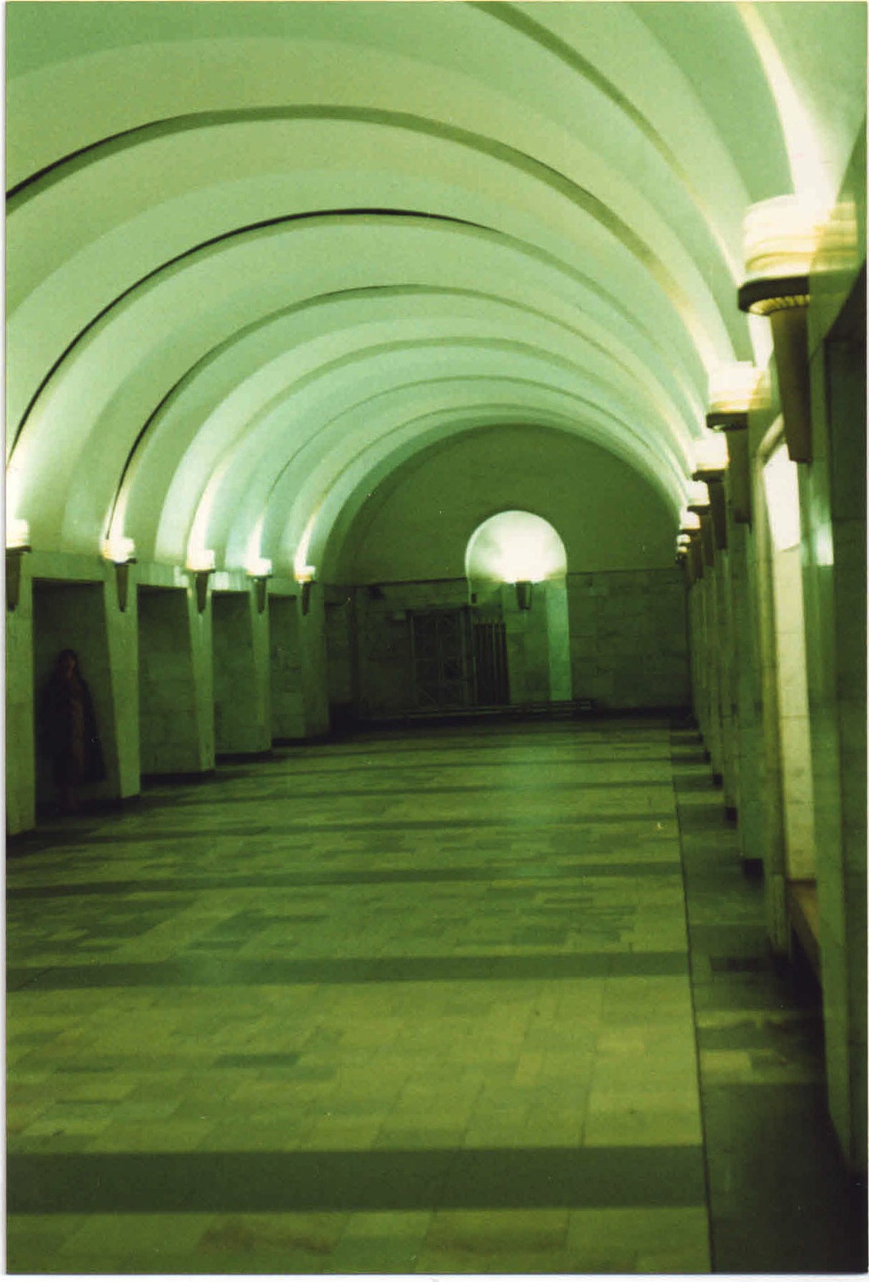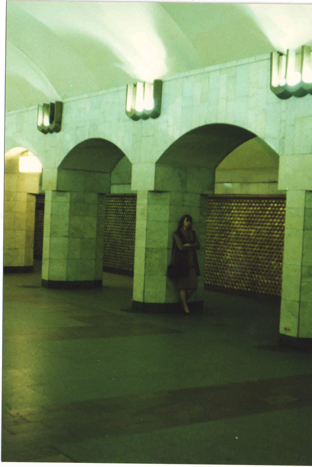 Стены всегда были чёрные. От ртутных ламп нередко даётся зеленоватый оттенок. А там в 90-е освещение не только работало вполсилы, но и лампы были менее яркие и др. оттенка. Кстати, на фото с эскалаторами эти зелёноватые блики на балюстрадах особенно заметны.