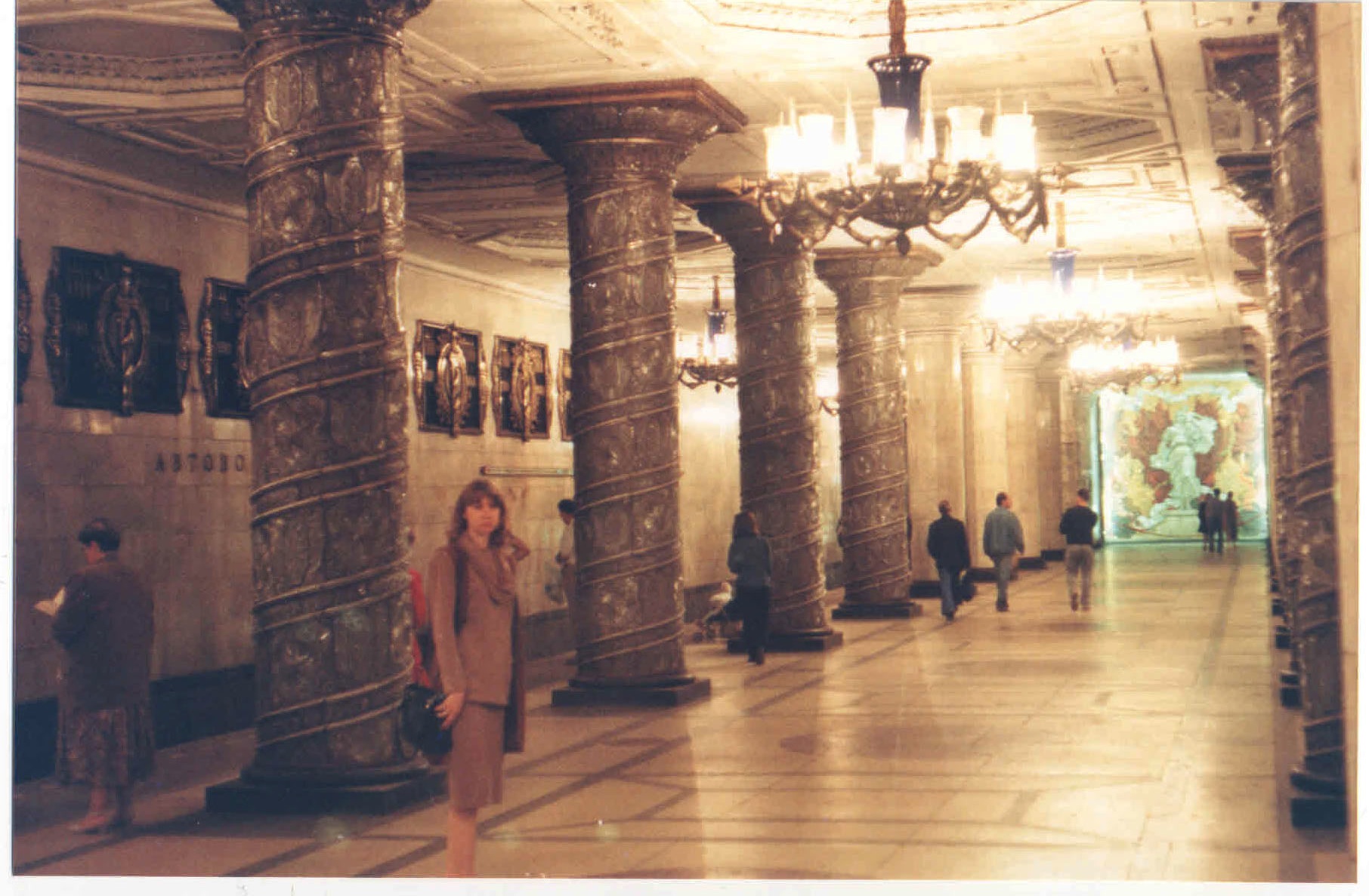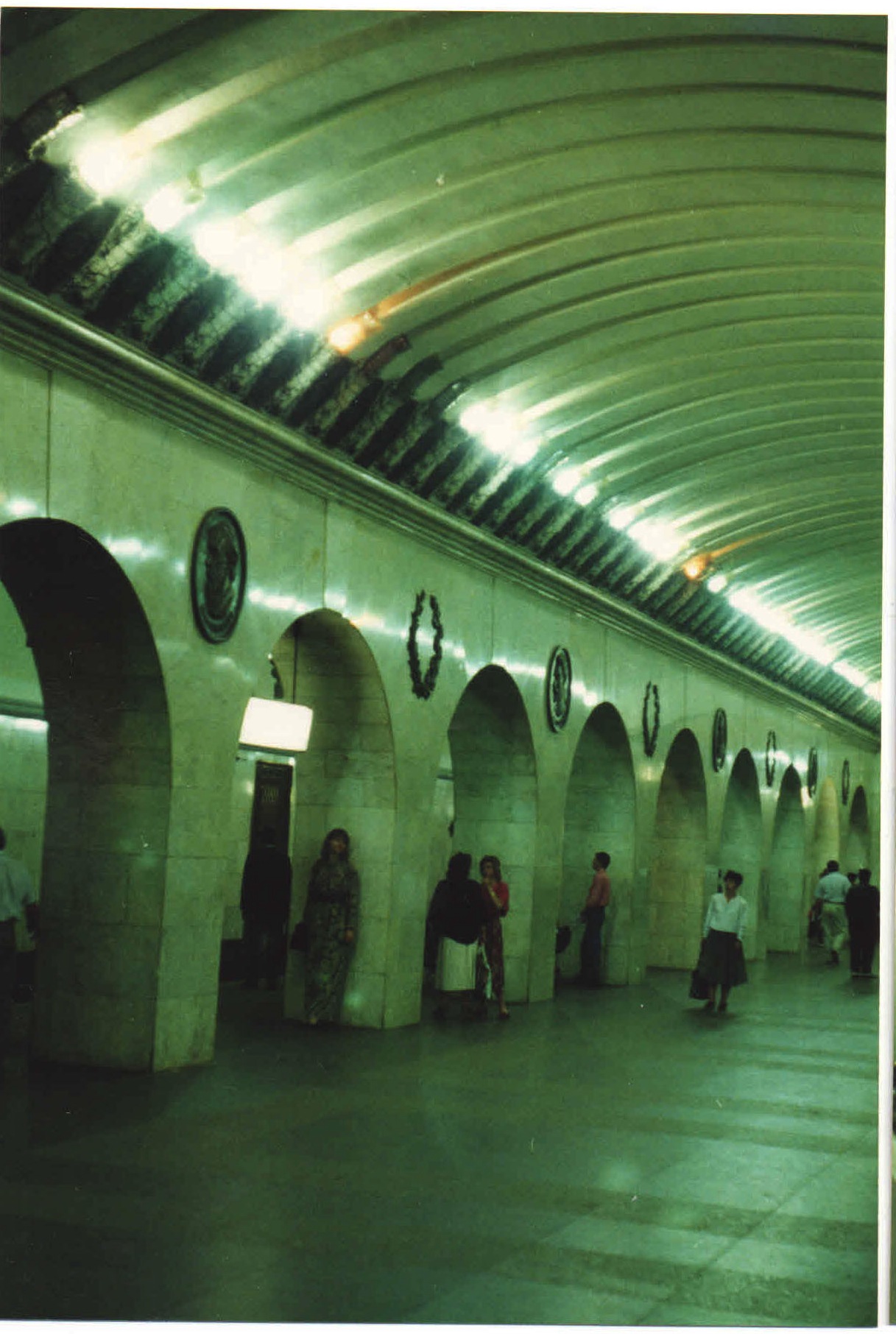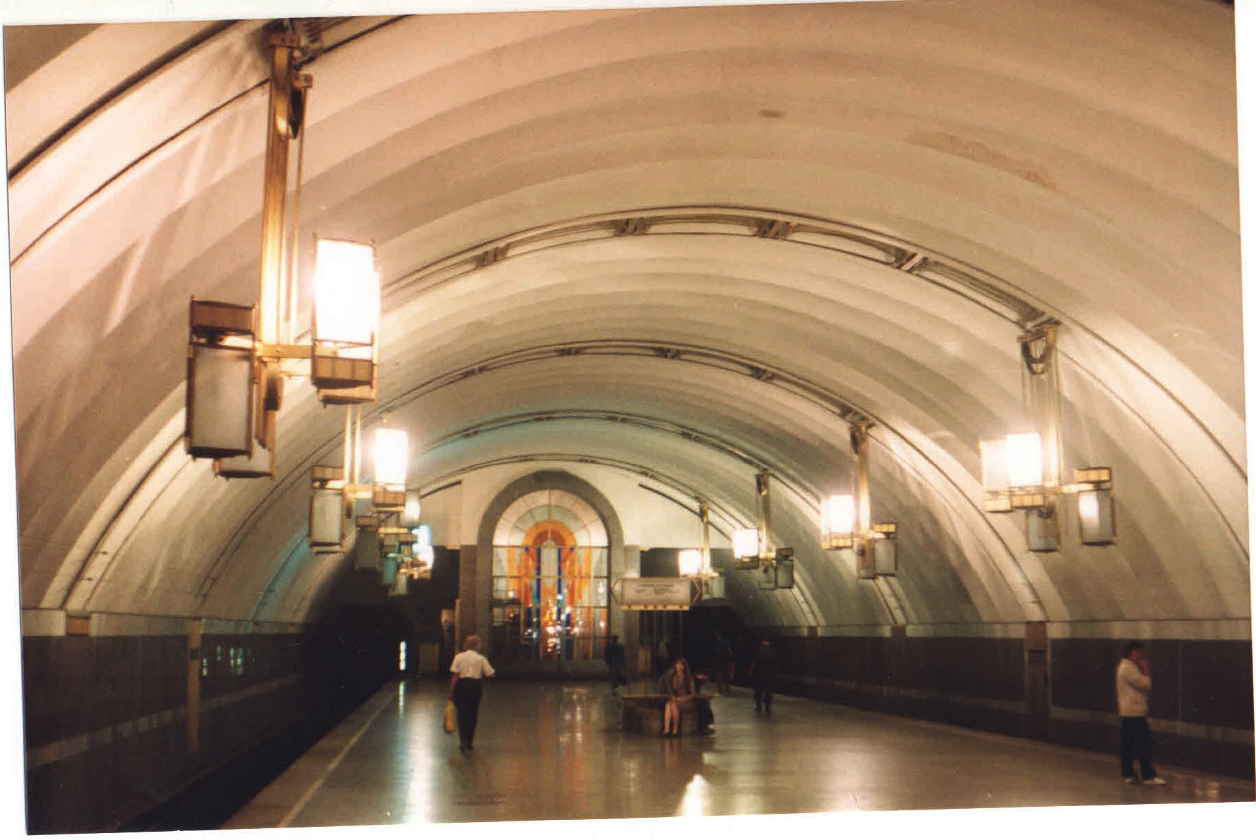 Стены всегда были чёрные. От ртутных ламп нередко даётся зеленоватый оттенок. А там в 90-е освещение не только работало вполсилы, но и лампы были менее яркие и др. оттенка. Кстати, на фото с эскалаторами эти зелёноватые блики на балюстрадах особенно заметны.