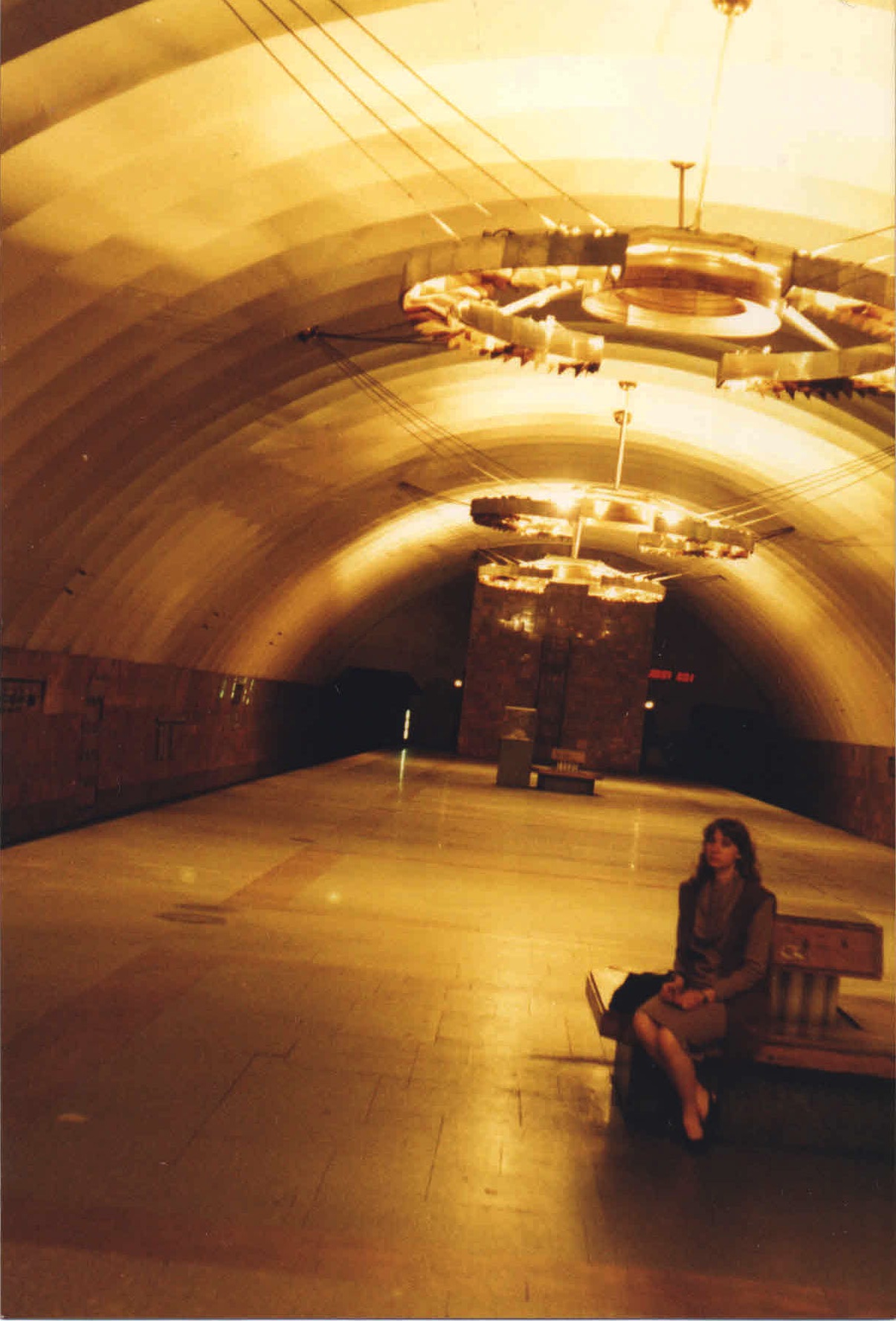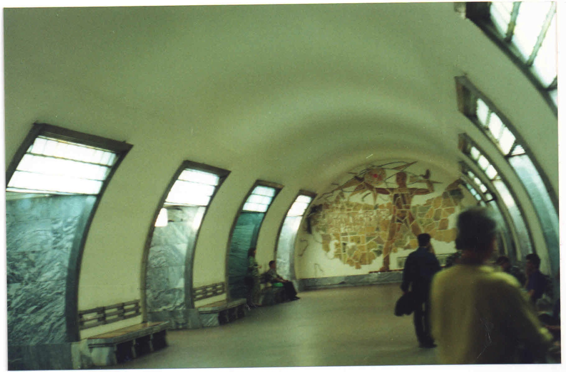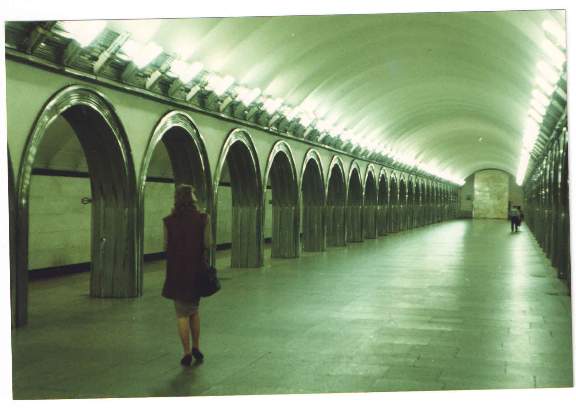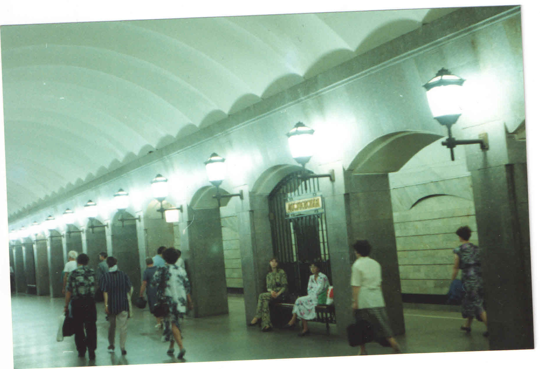 Стены всегда были чёрные. От ртутных ламп нередко даётся зеленоватый оттенок. А там в 90-е освещение не только работало вполсилы, но и лампы были менее яркие и др. оттенка. Кстати, на фото с эскалаторами эти зелёноватые блики на балюстрадах особенно заметны.