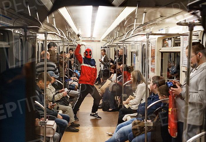 05-07-2017 Пассажиры в костюмах Человека-паука и Дэдпула выступают в вагоне Санкт-Петербургского метрополитена. Фото: Роман Пименов