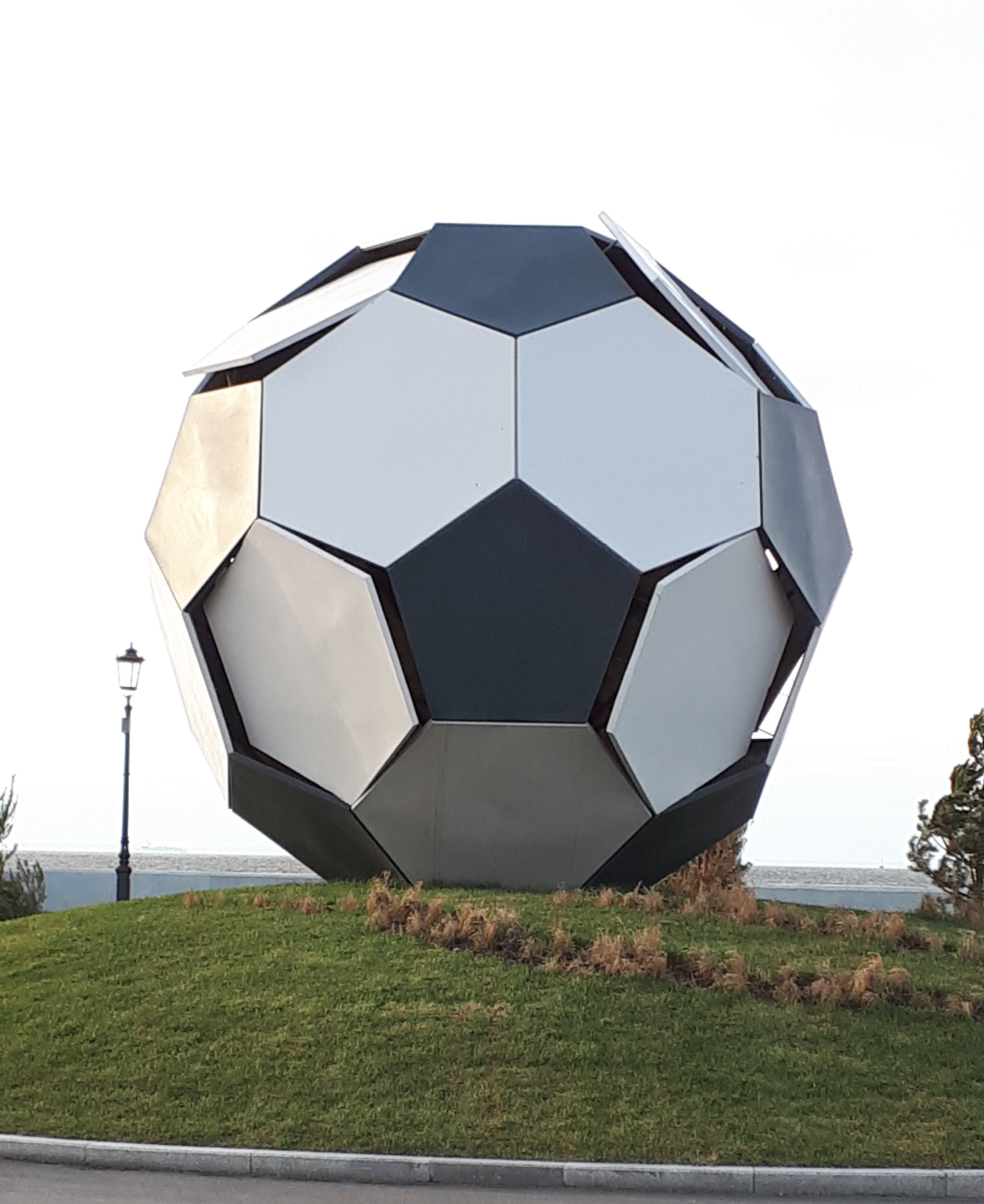 Честно говоря, от нового ландшафтного дизайна ожидал большего. Поставили лавочки, качели, убрали грязь перед набережной. Но это всё. Зато поставили огромный футбольный мяч, который почему-то расслаивается на отдельные пластины. Если это такая задумка автора, то видимо, это символ нашего футбола. Если его просто раздербанило ветром, то символ всей нашей бесхозяйственности и халтуры. На предыдущих фотках в этой теме не очень видно, было это раньше или нет.