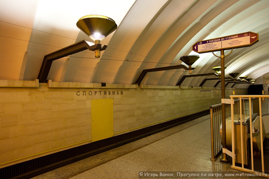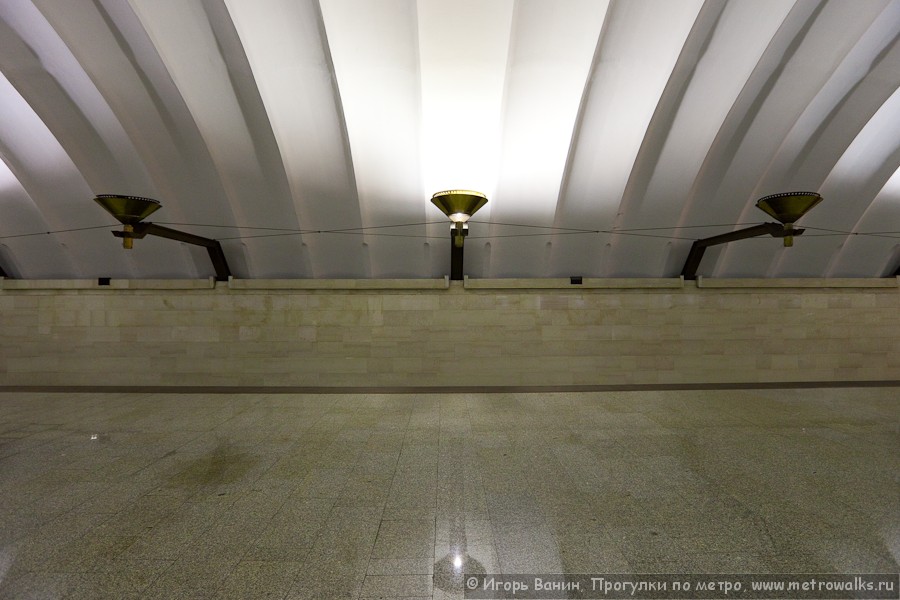 Так "повезло" и крайнему светильнику над неиспользуемым путём Спортивной со стороны эскалаторов: днём он горит, а вечером - нет, выключена ровно половина светильников над путями, из-за чего на станции стоит неприятный полумрак.