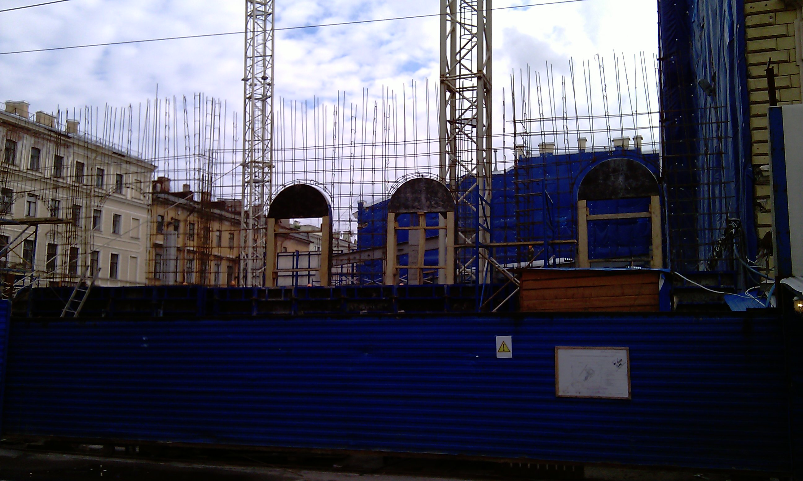 Судя по всему, как минимум весь "первый" этаж будут монолитно в бетоне отливать, сегодня лицезрел "висящие" в арматуре рамы окон. Активно идет сужение тротуара на малой морской.