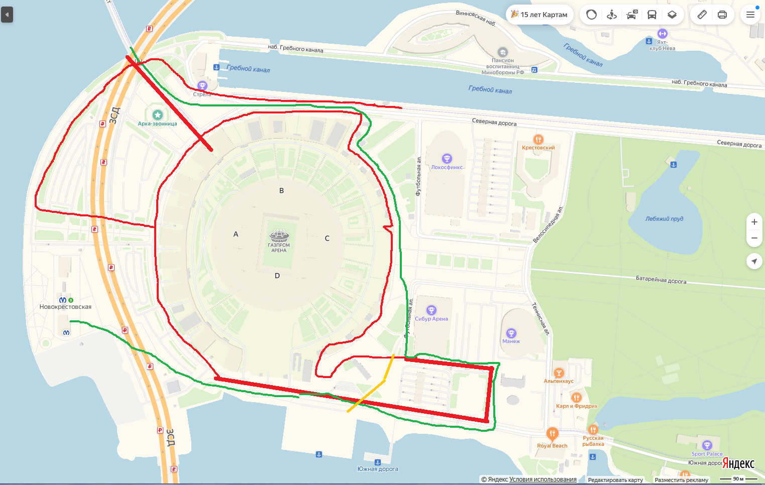 Сильно не пинайте за качество иллюстрации, нарисовал на скорую руку в Пэинте. Красные линии - заборы, зеленые - единственный кратчайший вариант попасть с Яхтенного моста на Новокрестовскую %) Оранжевая линия - пешеходный мост, доступный только во время матчей.