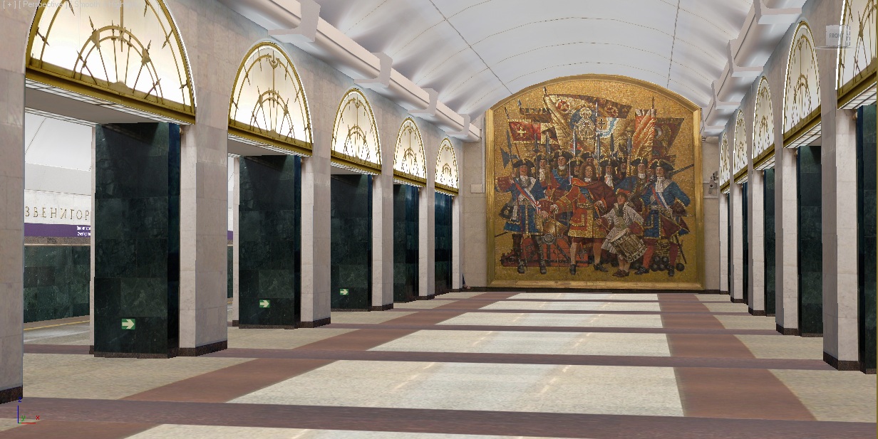 Лиговка. Здесь многое добавил от себя. это и развандаленные НИПом указатели, и и декоративные элементы между светильниками на своде, которые почему-то были сокращены, и сделал все светильники работающими.