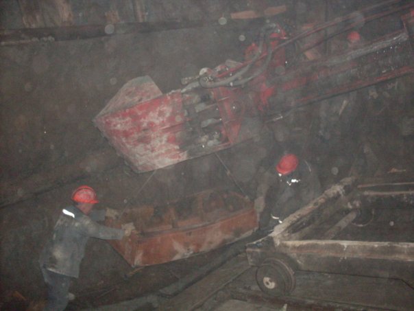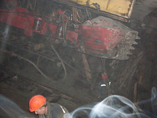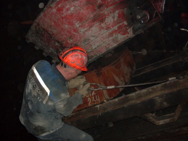 Вчера я проезжал, всё как обычно -- на наклонном ходе работает автокран, тот что выгружает пород, а к шахте подъезжают самосвалы...