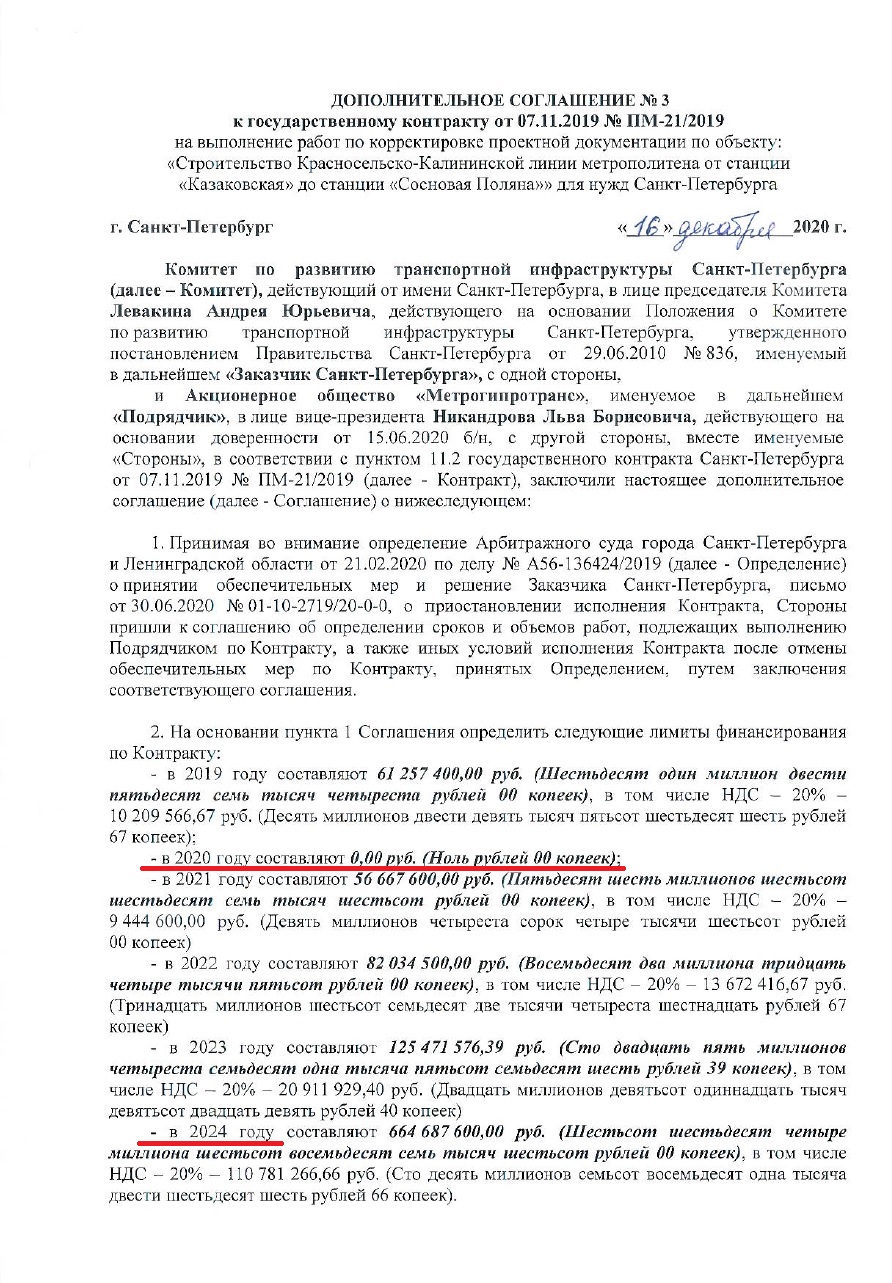 К гос. контракту с АО "Метрогипротранс" на выполнение работ по разработке проектной документации по объекту: "Строительство участка Красносельско-Калининской линии метрополитена от станции "Казаковская" до станции "Сосновая поляна" подписано доп. соглашение №3 от 16.12.2020 г., в соответствии с которым официально оформлена приостановка работ по контракту, за 2020 год за выполненные работы оплата не предусмотрена (бурили все лето бесплатно), а также срок исполнения контракта перенесен с 31.12.2022 г. на 31.12.2024 г.