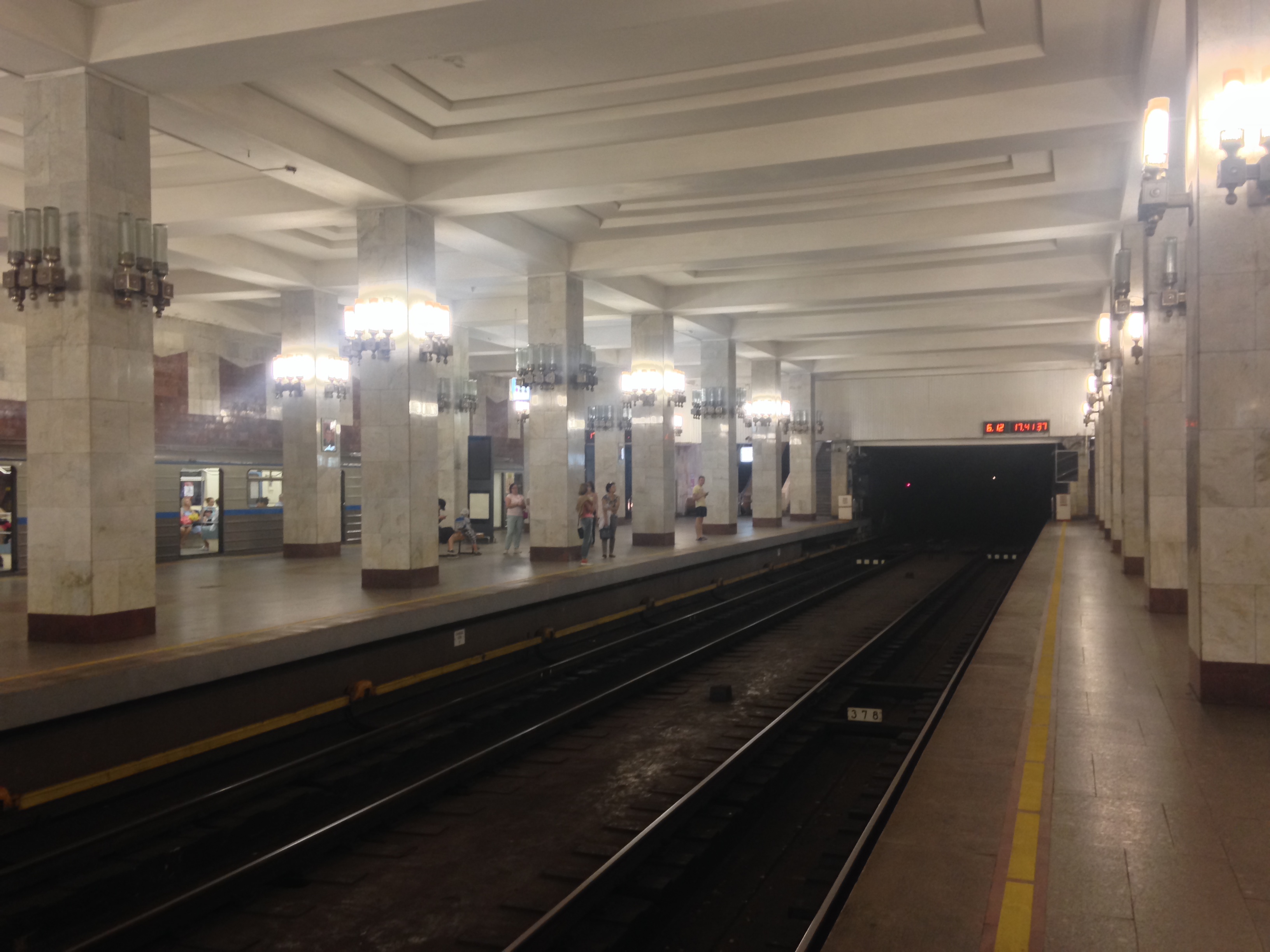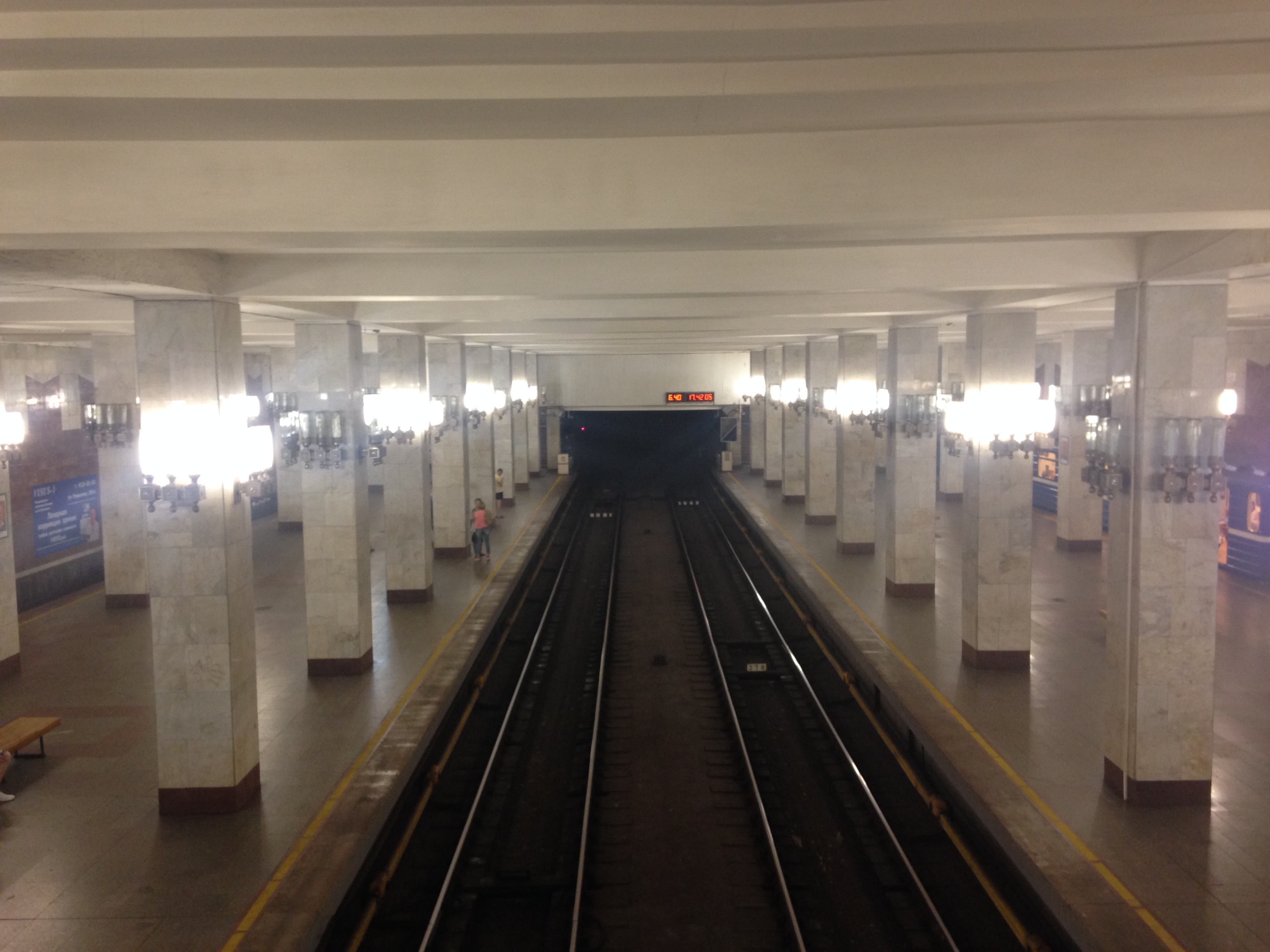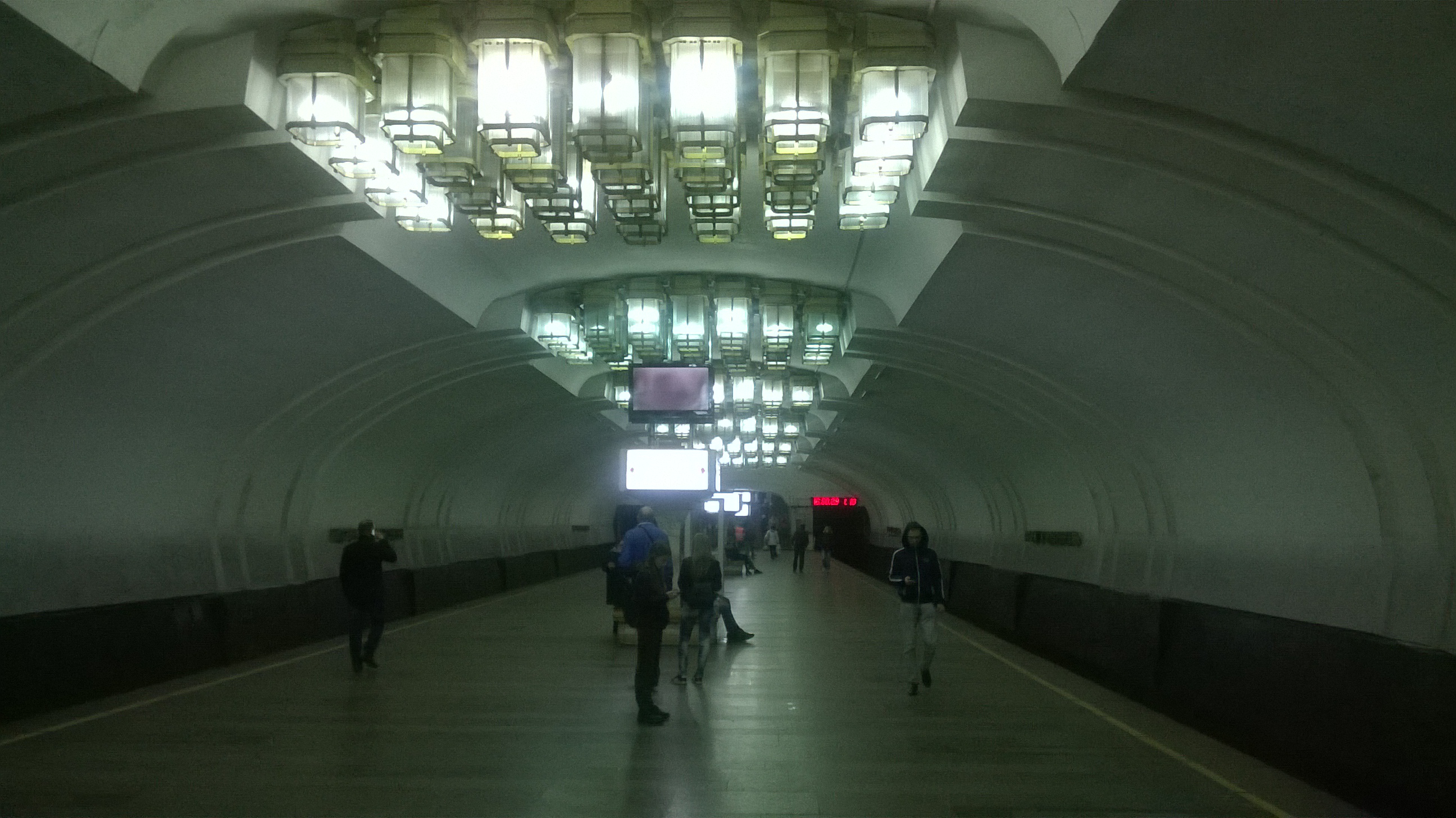 Станция "Московская" монументальная и самая большая, но указатели гостей города могут оставить в непонятках. Не сразу сообразишь, что стрелочка со штрихом обозначает переход по лестнице. Из примечательного: ка колоннах висят портреты лучших работников метрополитена. Маршруты поездов здесь благоразумнее всего отслеживать по электронным указателям на кабине головного вагона. Больше двух поездов в этот день на станции не появлялось.