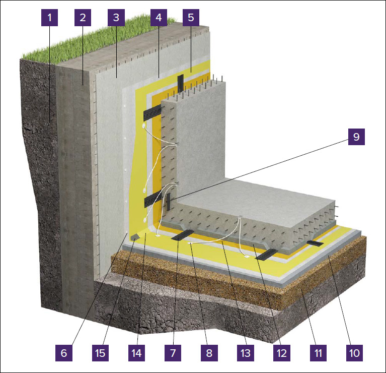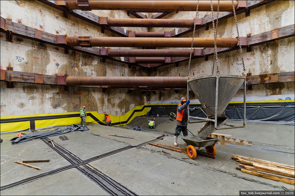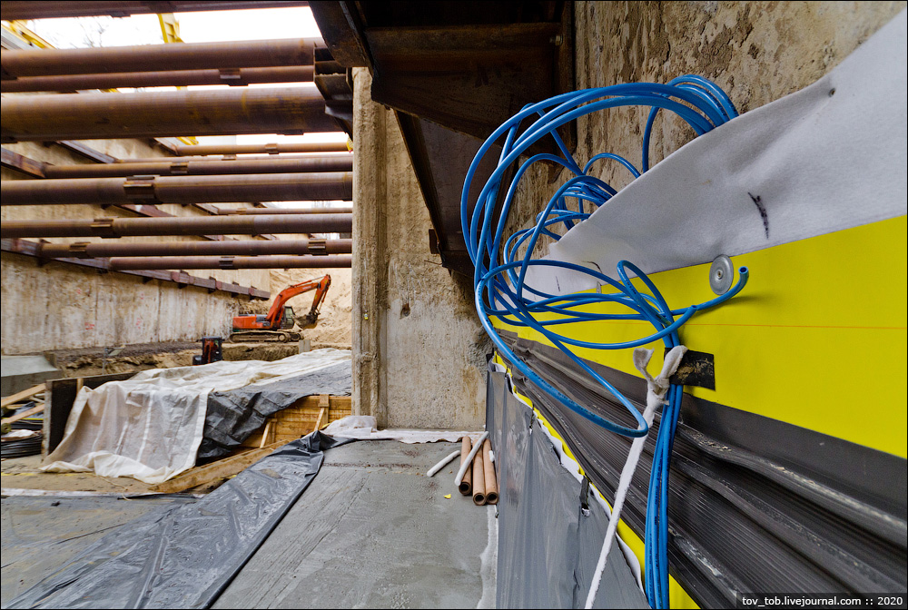 13. Тут "слоеный пирог" гидроизоляции видно во всей красе. Внизу видно ту самую гидрошпонку черного цвета, выше желтая мембрана, еще выше геотекстиль. И ко всему этому прикручен целый моток полых трубок. Эти трубки закреплены в определенных местах на мембране с помощью так называемых инъекционных штуцеров (как-нибудь покажу, как они выглядят). В случае, если в будущем в мембране возникнут протечки, то с помощью этой инъекционной системы можно будет дистанционно закачать специальный гель и "вылечить" мембрану. Секционирование мембраны с помощью гидрошпонок нужно, чтобы разделить ее на небольшие участки. Тогда, с одной стороны, при возникновении протечек вода не будет свободно перемещаться вдоль всей конструкции и проблемное место можно будет легко локализовать. С другой стороны, при закачке "ремонтного" геля не нужно будет его фигачить на всю площадь стены или пола. В старых тоннелях подобные работы по лечению протечек требуют бурения скважин в тоннельных конструкциях и закачки специальных растворов за обделку. По идее новая система должна быть более простой и точной. Но посмотрим, как она поведет себя на практике. Меня вот смущают эти инъекционные трубки, т.к. интуитивно кажется, что их просто придавит бетоном сверху и ничего потом не закачается. Если вы знаете примеры и результаты использования этой "ремонтной" системы в мировой практике, напишите, плз :)