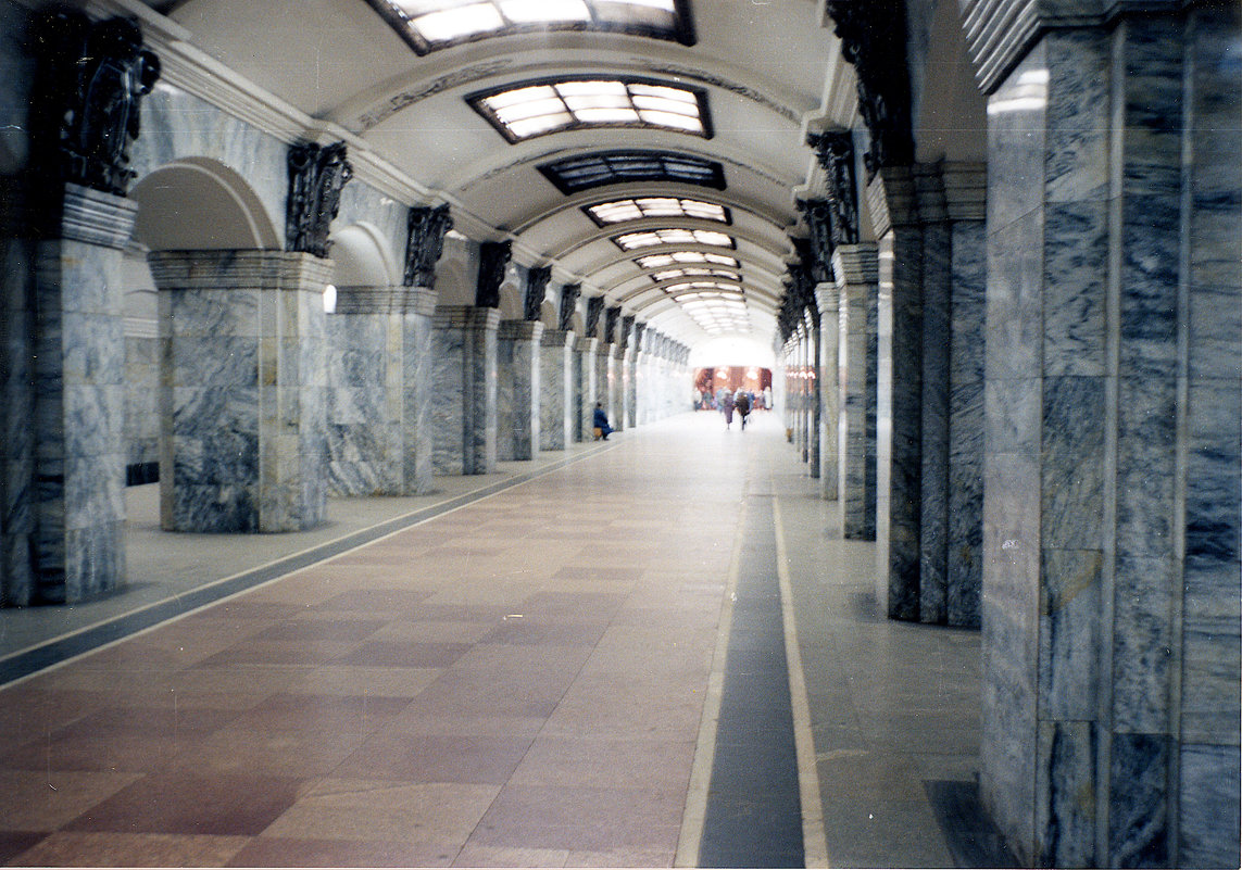 Конкретно такого фото, кажется, еще не видел. На колоннах еще оригинальная облицовка, на потолке - светильники еще в оригинальном виде, но в плохом техническом состоянии. Лавочки стоят у колонн.