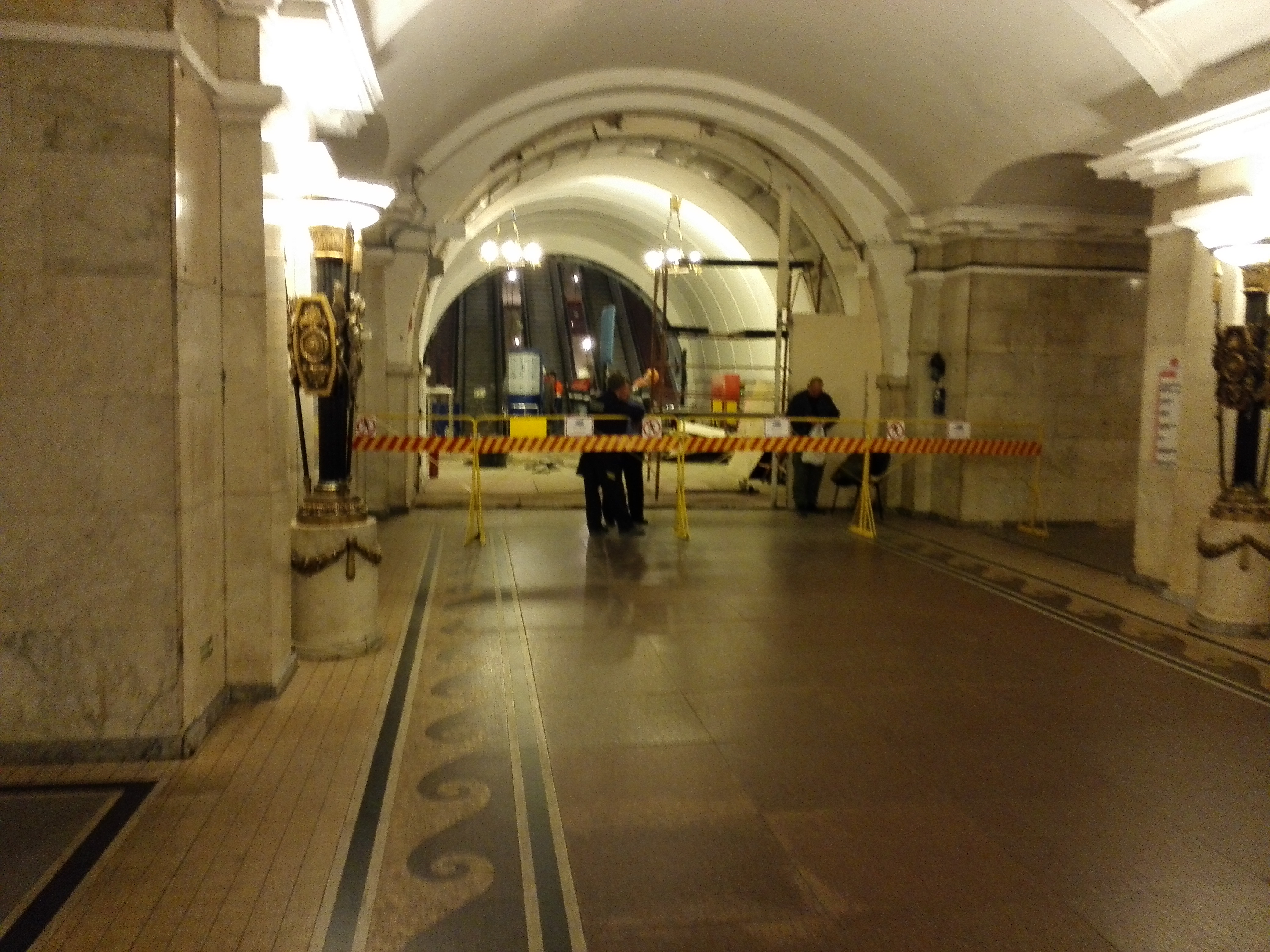 Демонтирована перегородка между центральным залом станции и наклонником. Наводят последний марафет, на светильниках в НХ ещё не надеты плафоны. Светильники оставлены старые, облицовка баллюстрад вроде сохранена "под дерево", издалека, с перехода на Звенигородскую, казалось так.