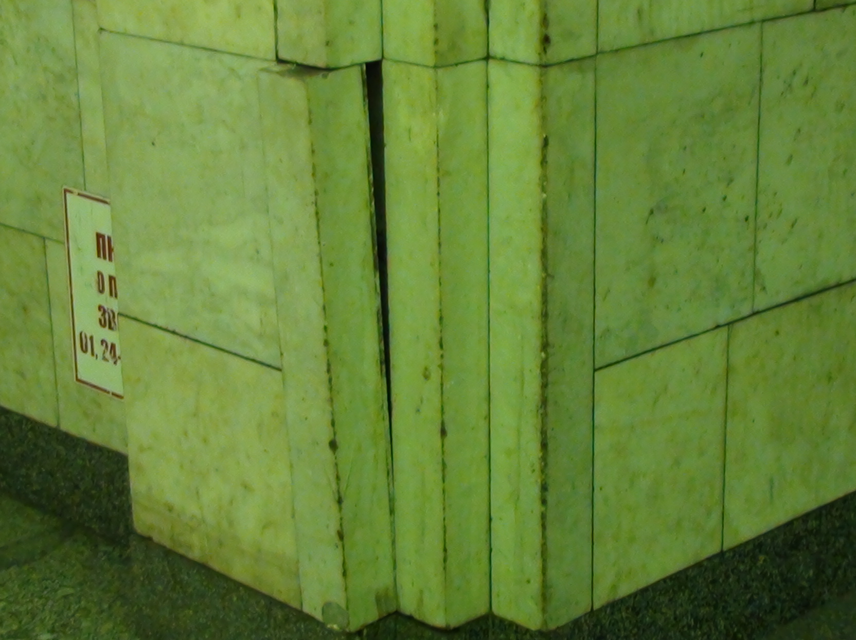 Вообще-то, перед заливкой раствора все детали облицовки должны быть надёжно закреплены к каркасу металлическими скобками. Но, так как облицовку "Сенной площади" проводили в 1991-93гг., когда шел развал страны, - это, судя по всему, сделано не было.