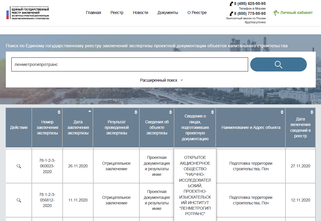 Alexsey, ты не прав. В Едином государственном реестре заключений экспертизы проектной документации объектов капитального строительства на сайте Федерального автономного учреждения (ФАУ) «Главное управление государственной экспертизы» России, поиск по слову "Ленметрогипротранс" - оба этих отрицательных заключения зарегистрированы. И, как видно, документация разработана ОАО "НИПИИ "ЛЕНМЕТРОГИПРОТРАНС".