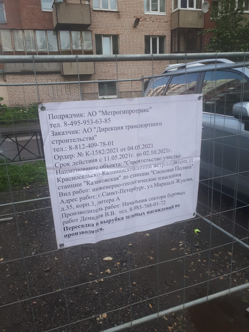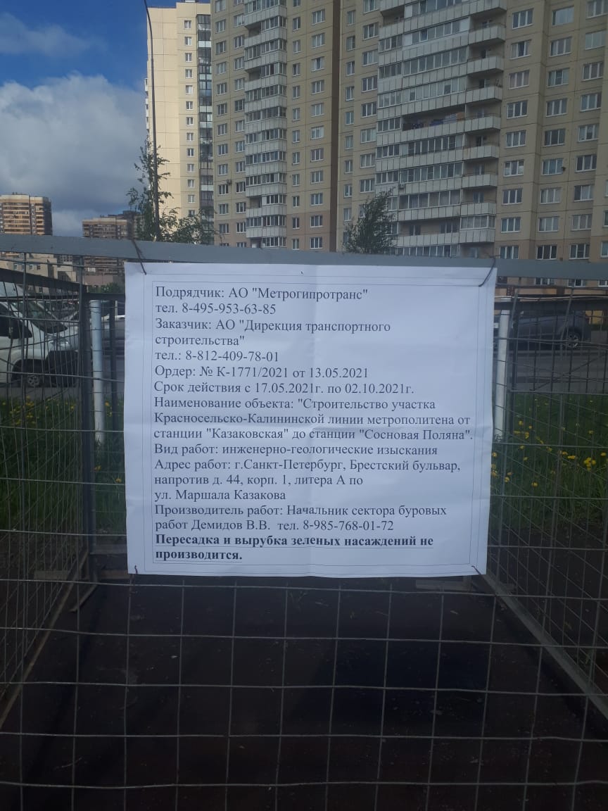 В рамках гос. контракта АО "Метрогипротранс" от 7 ноября 2019 г. № ПМ-21/2019 на выполнение работ по разработке проектной документации по объекту: "Строительство участка Красносельско-Калининской линии метрополитена от станции "Казаковская" до станции "Сосновая поляна" для выполнения инженерно-геологических изысканий ГАТИ выдано 7 ордеров по адресам: