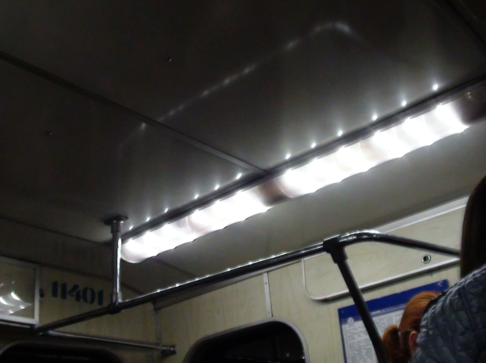 Это был совершенно ужасный вариант, очень синий, при этом слабо светящий. Несмотря на слабый свет, светильники слепили, т.к. имели "щелевую" конструкцию. На фото вообще не так. Может, не во всех вагонах такое было?