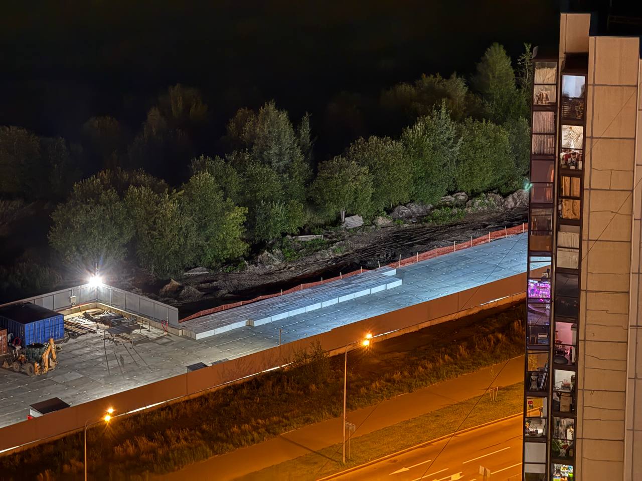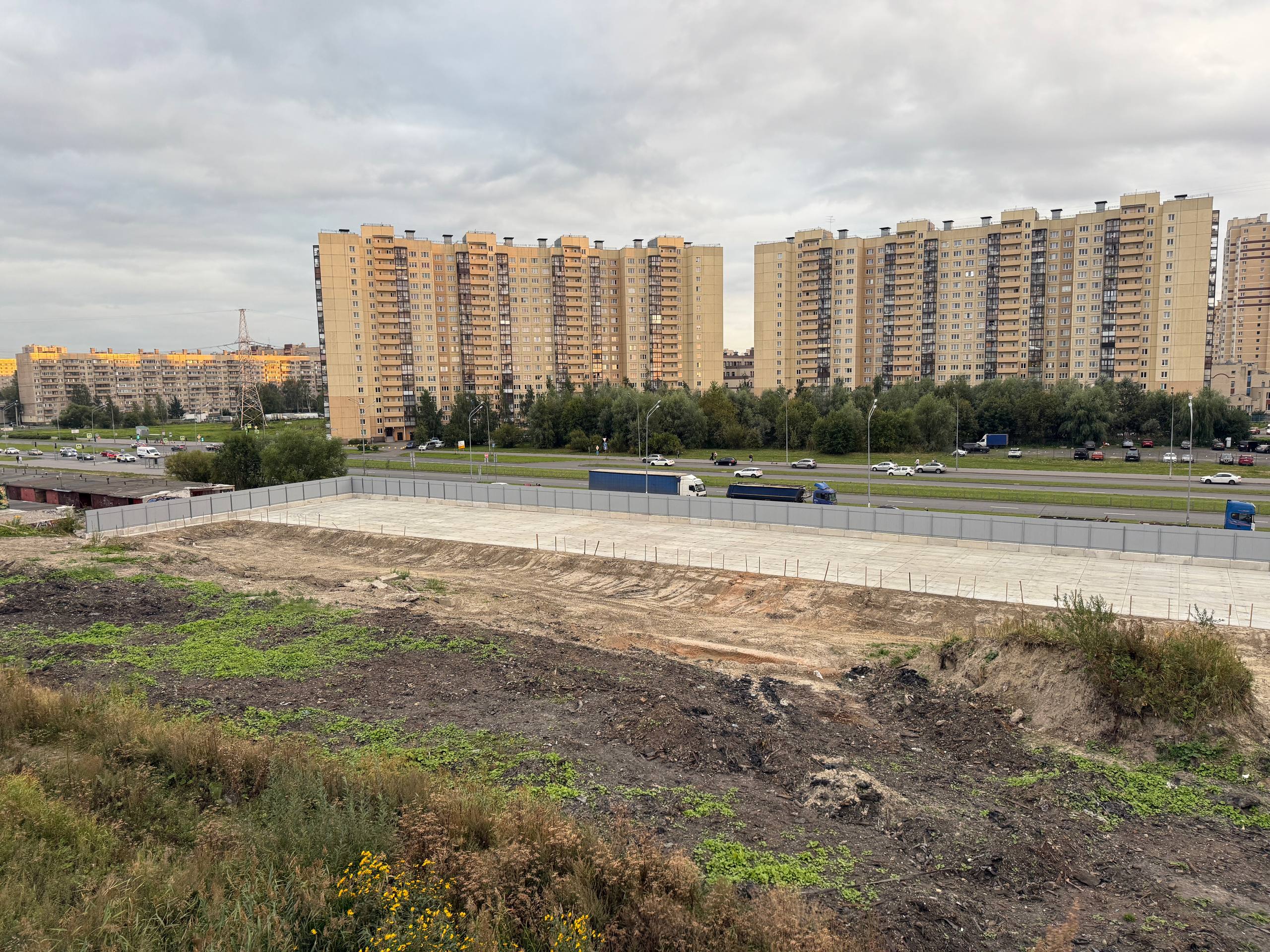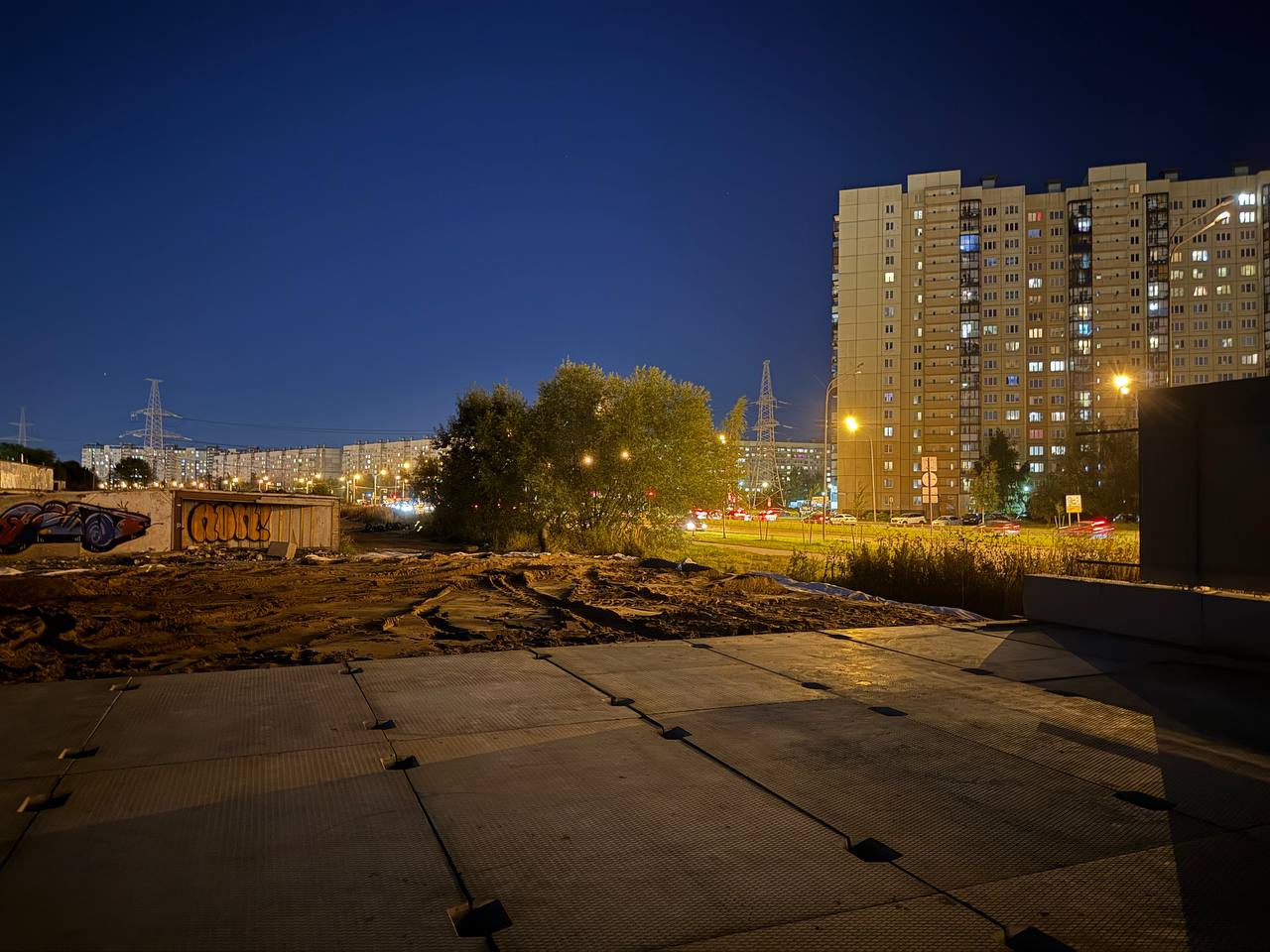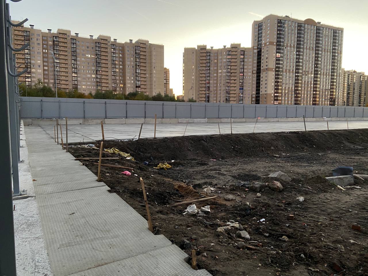 На данный момент ограждение дошло до крайней точки, немного не доходя Брестского бульвара. Теперь ограждение завернуло вглубь участка. Территория в этом месте расчищена примерно на половину ширины будущей площадки, предстоит повести работы по понижению уровня земельного участка. Именно на отгораживаемом участке строительной площадки скоро начнётся сооружение котлована монтажно-щитовой камеры, в которых будут смонтированы два щита.