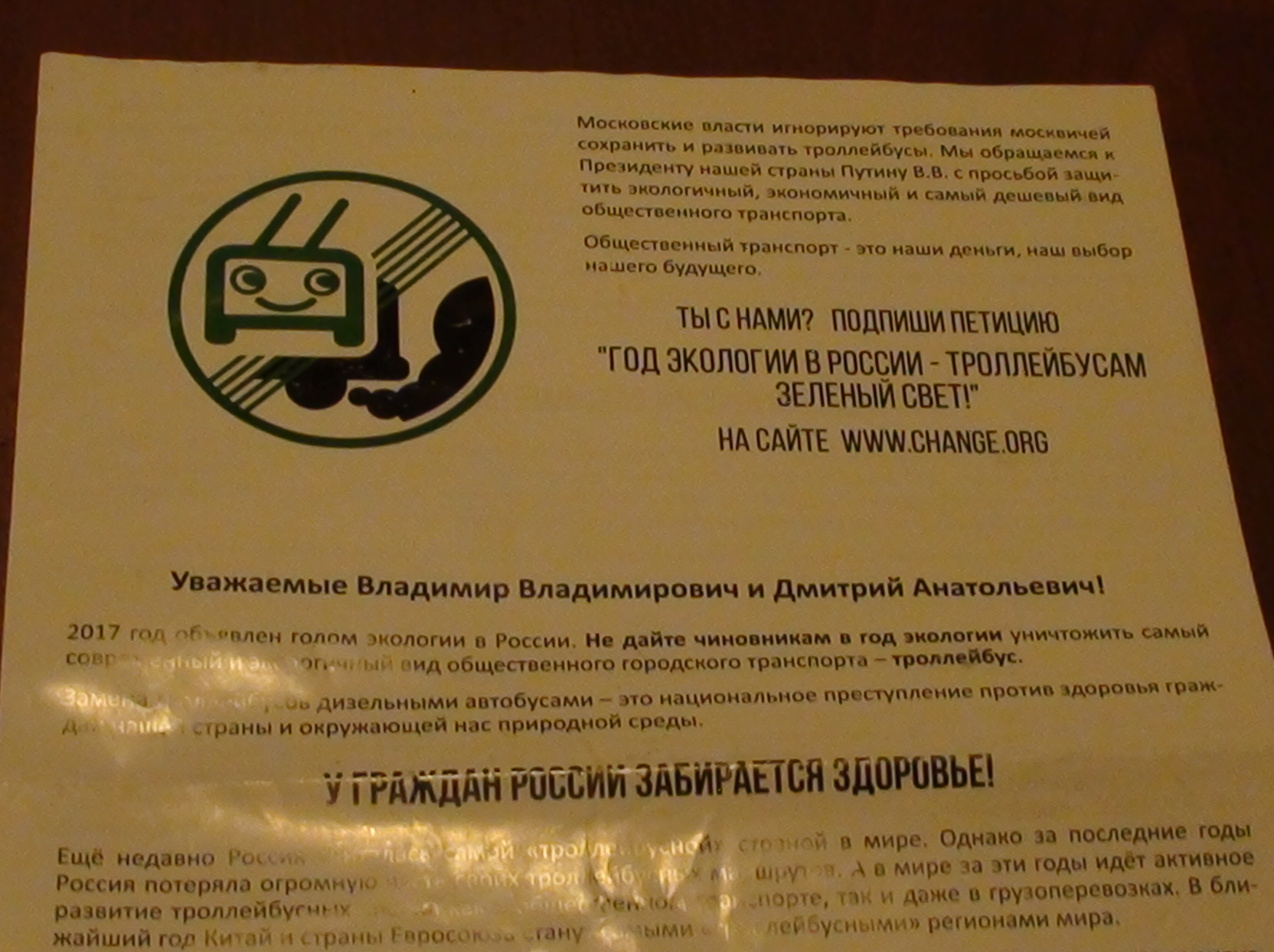 Году в 2017-м на одной из выставок (толи в Москве, толи в Питере) выдали такую вот листовку. Вокруг раздающего было человек 7-8. Меня попросили подписать петицию, чтобы сохранить Московский троллейбус. Даже если б я был фанатом московского (или какого-либо) троллейбуса, подписывать не стал (учитывая какие люди в этом замешаны). Поэтому листовку я взял на память. А вот исход мне был очевиден с самого начала. Хотя, несколько серьёзных московских фанатов троллейбуса вплодь до начала этого года НЕ верили, что троллейбус полностью ликвидируют.
