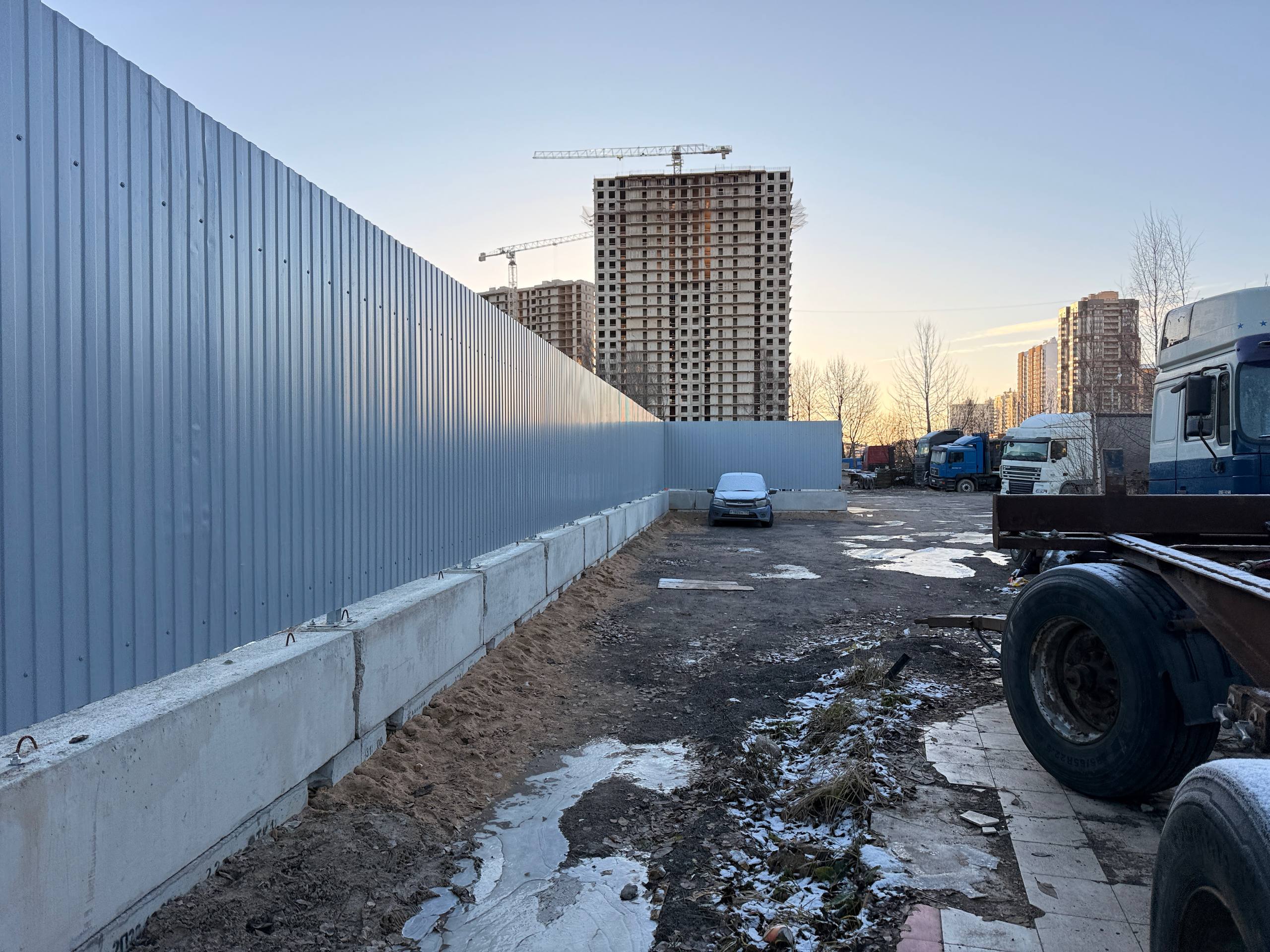 Судя по фото на предидущей странице для строительства временного забора сделали подъездные дороги и без проблем доставили материалы, в том числе тяжелые бетонные блоки. Вон там трактор катается, без проблем. Бетонные плиты и блоки в основание уложены.