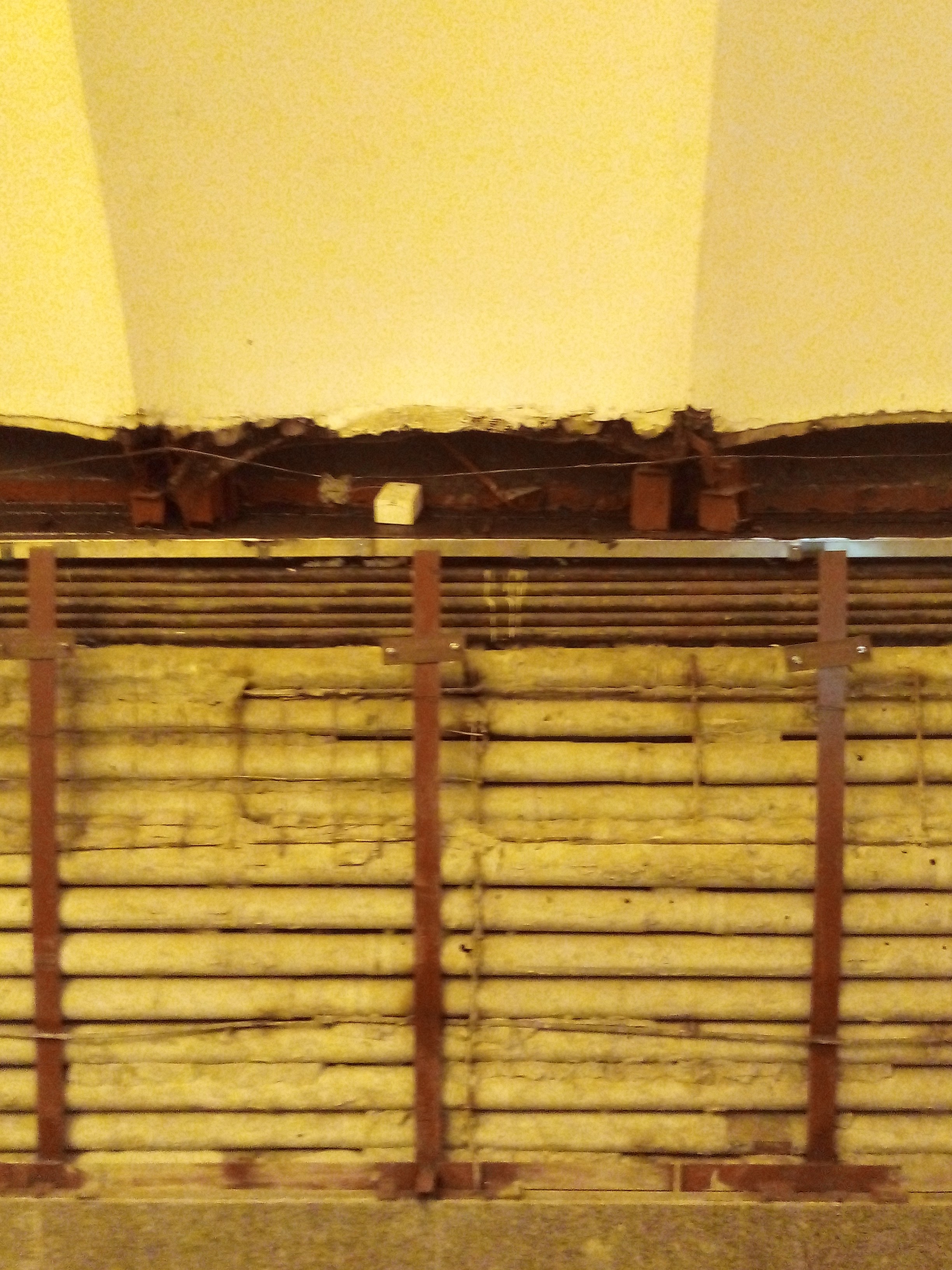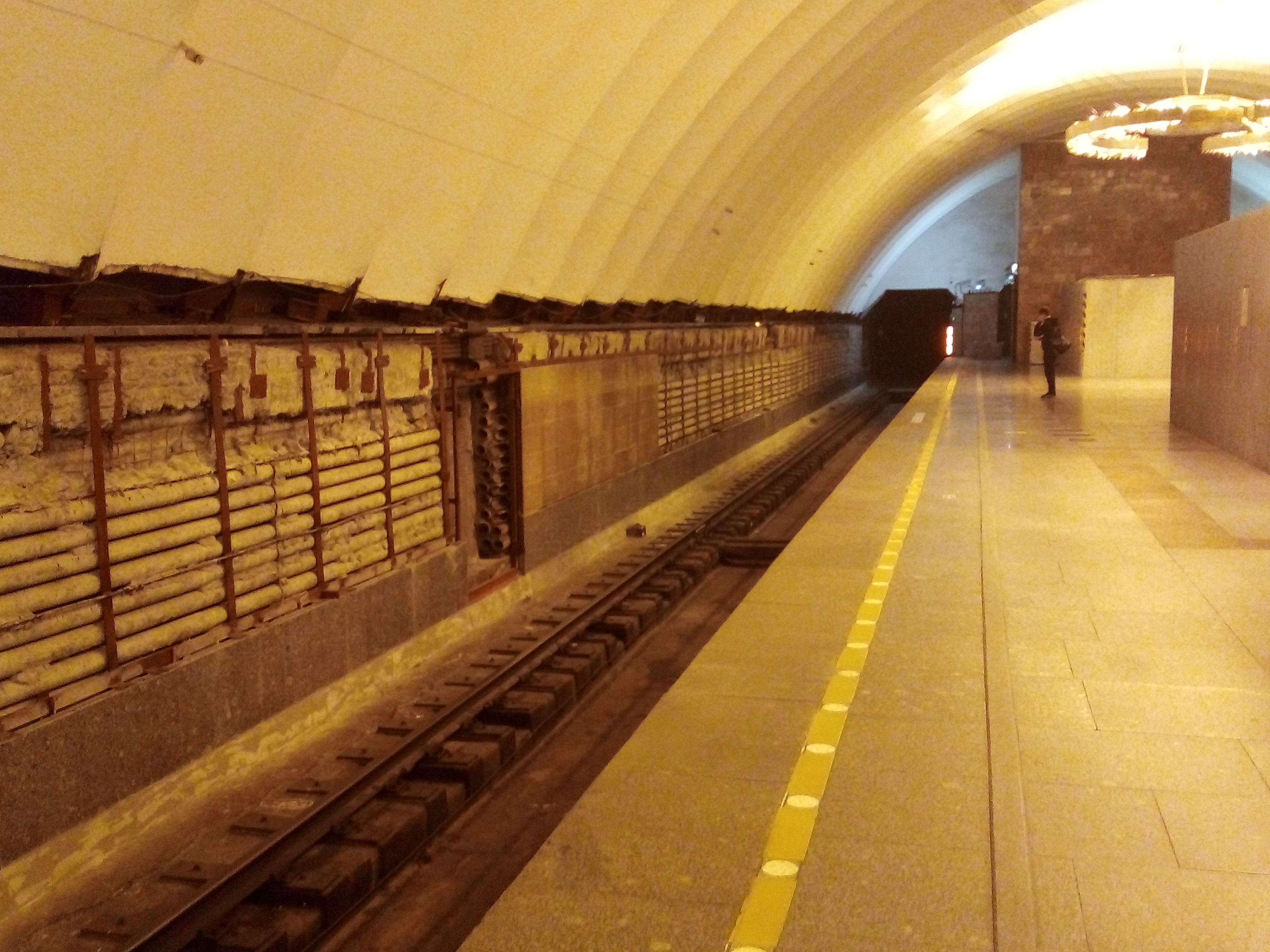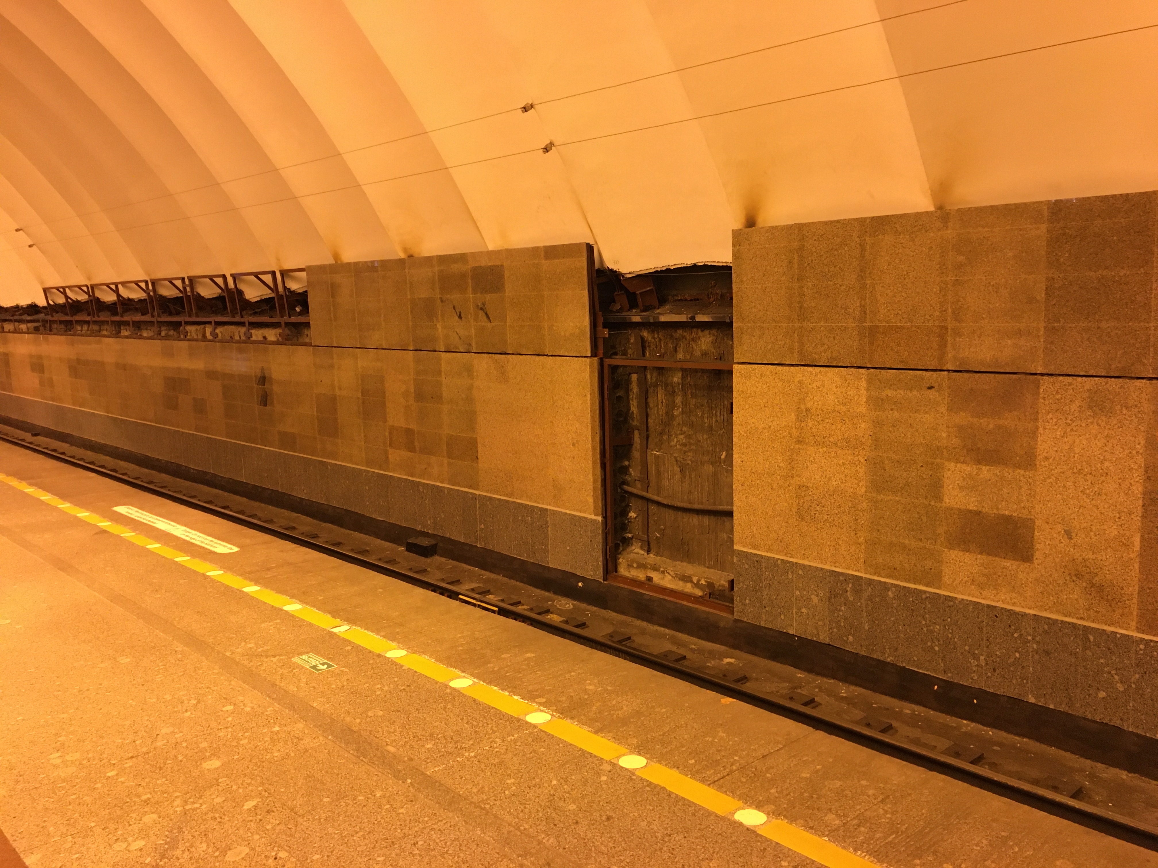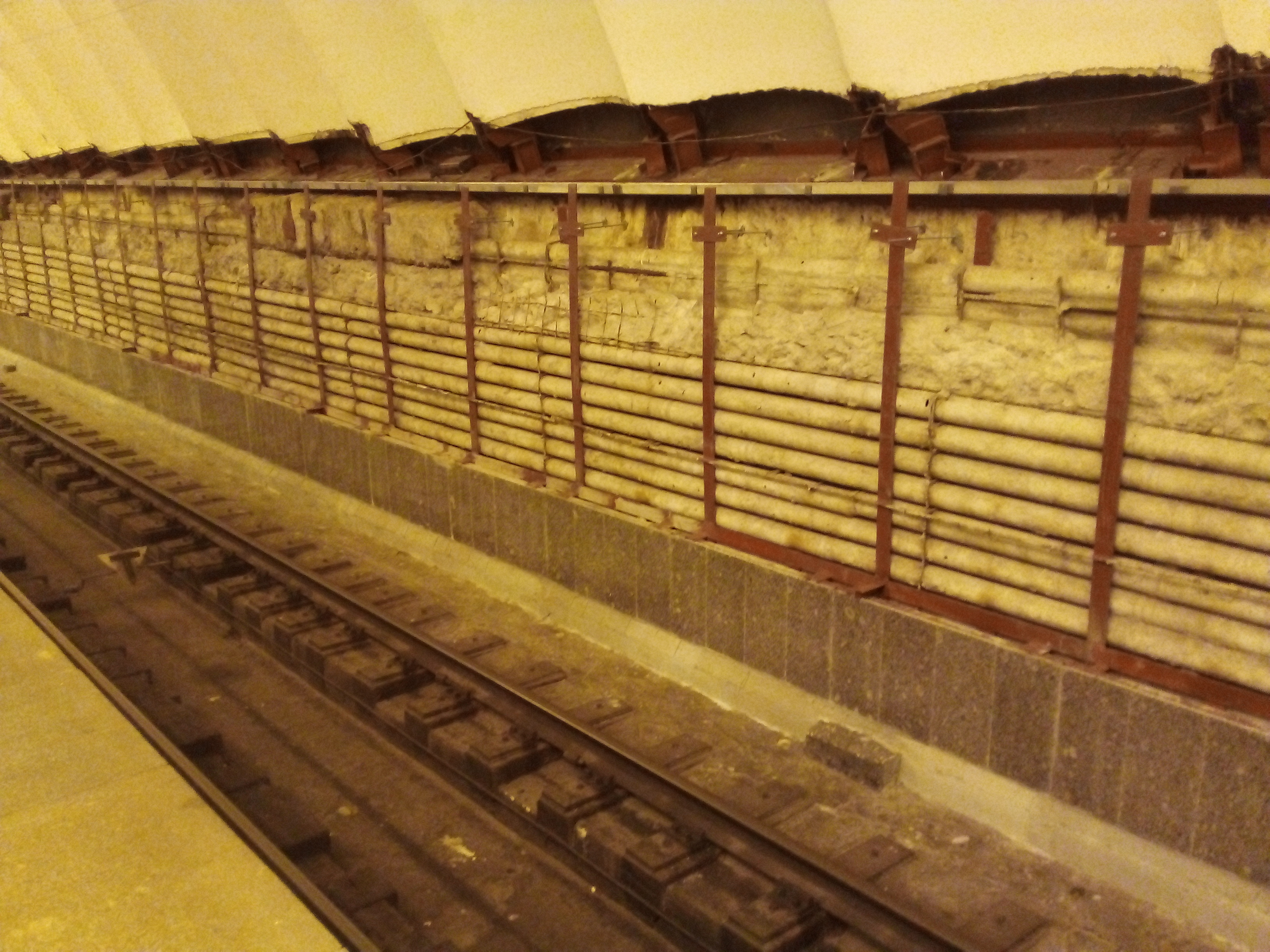 На Новочеркасской по первому пути закончили нижнюю часть облицовки путевых стен и смонтировали первый блок непосредственно самой облицовки. Как по мне, так совершенно не попали в цветовую гамму той облицовки, которая была ранее. Попытался отобразить это в фото, но фотокамера телефона не передает точно всю цветовую гамму, да еще с учетом освещения - тем не менее, что-то всё-таки получилось.