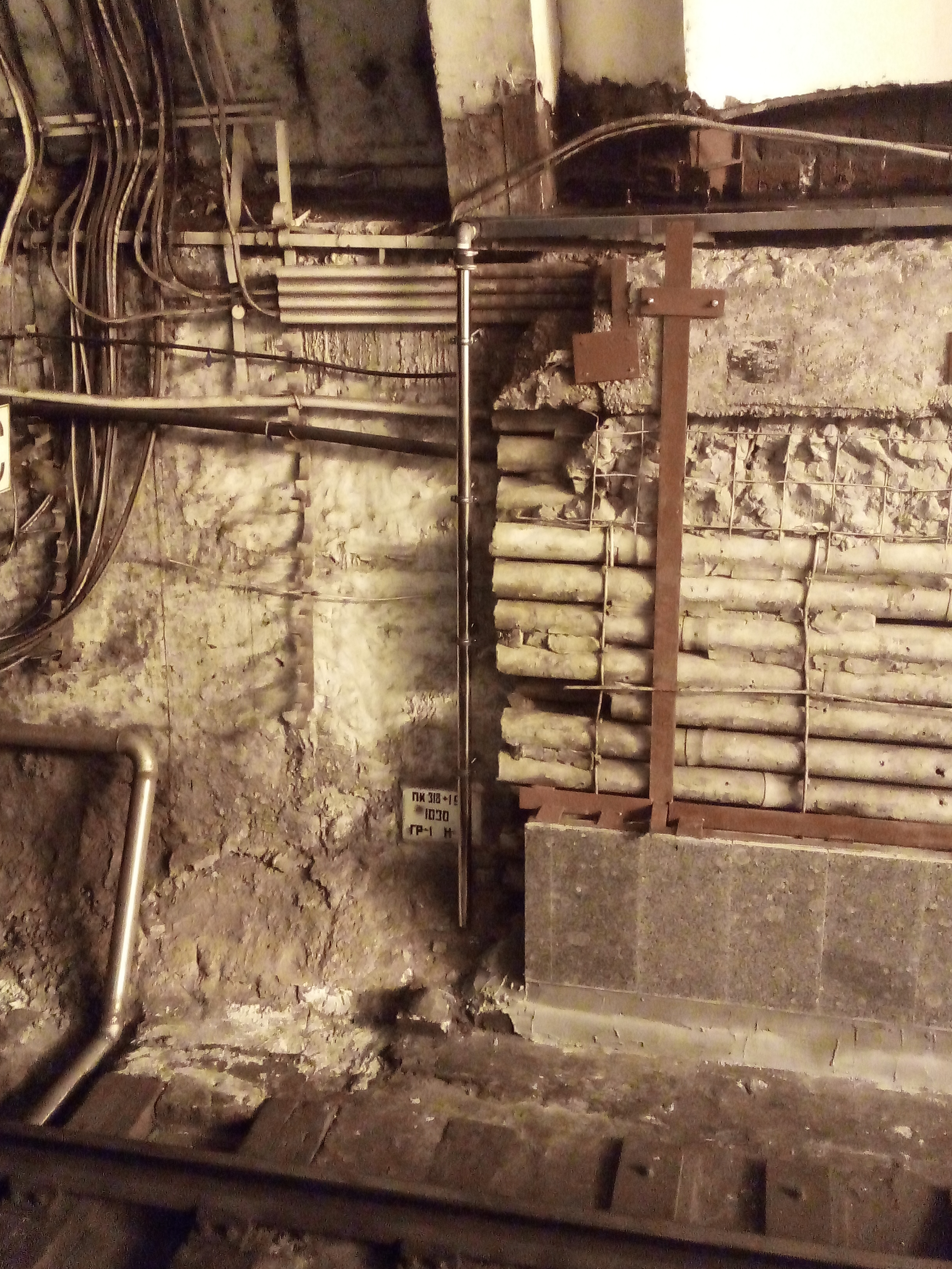 Еще обратил внимание на трубы, которыми соединили лоток, размещенный под водоотводящим зонтом станции над путевыми стенами, в районе кабельных дверей путевых стен (так как там распределительные коробки освещения - это только по 1 пути). Получается, что визуально эти трубы являются самой нижней точкой лотка (могу ошибаться, но на глаз выглядит именно так), и если в лоток будет поступать вода, то именно в районе этих труб она, по идее, и будет скапливаться (но там идеально сухо, воды не наблюдается совсем). Заканчивается этот лоток сливной трубой (я ее снял на фото).