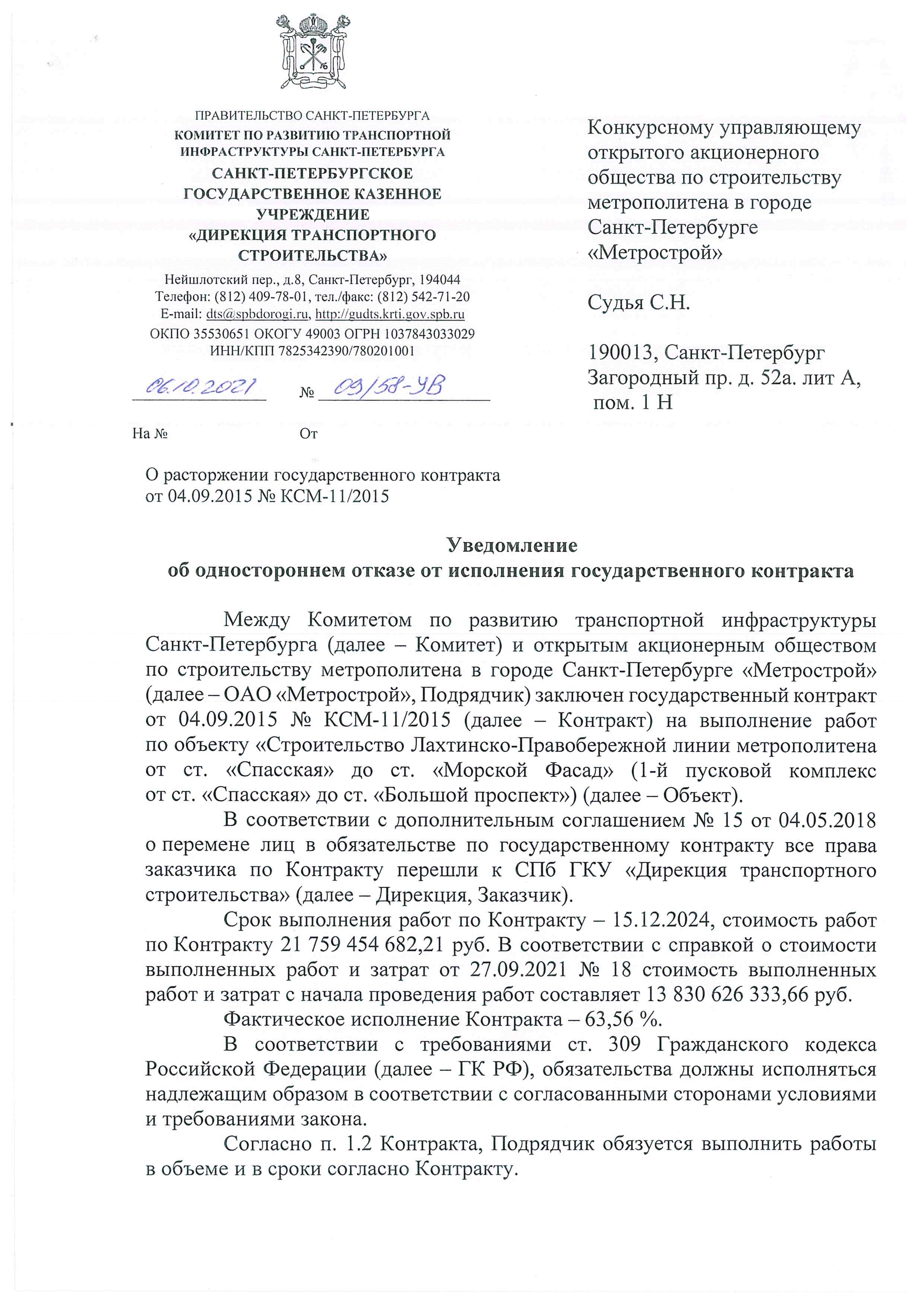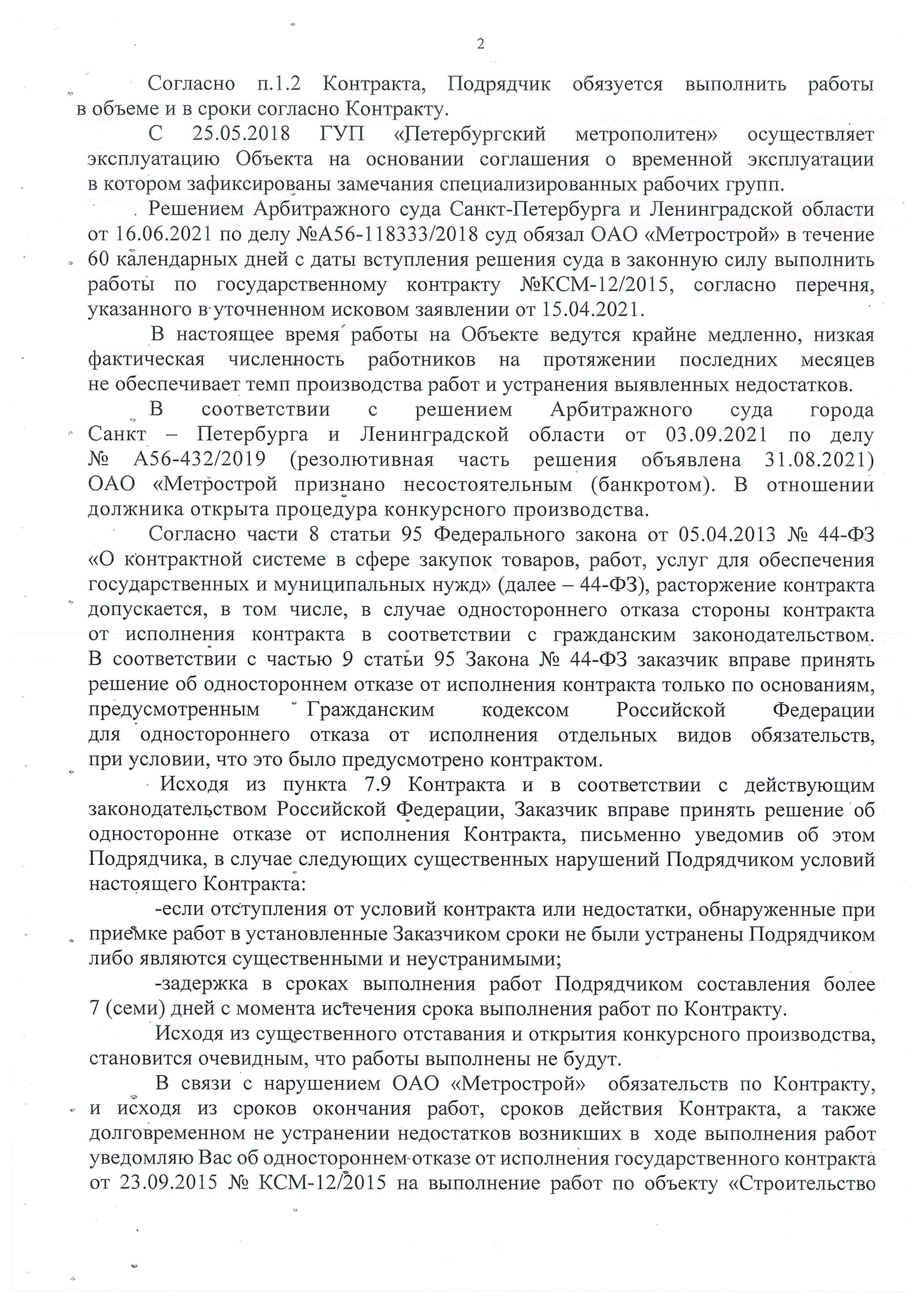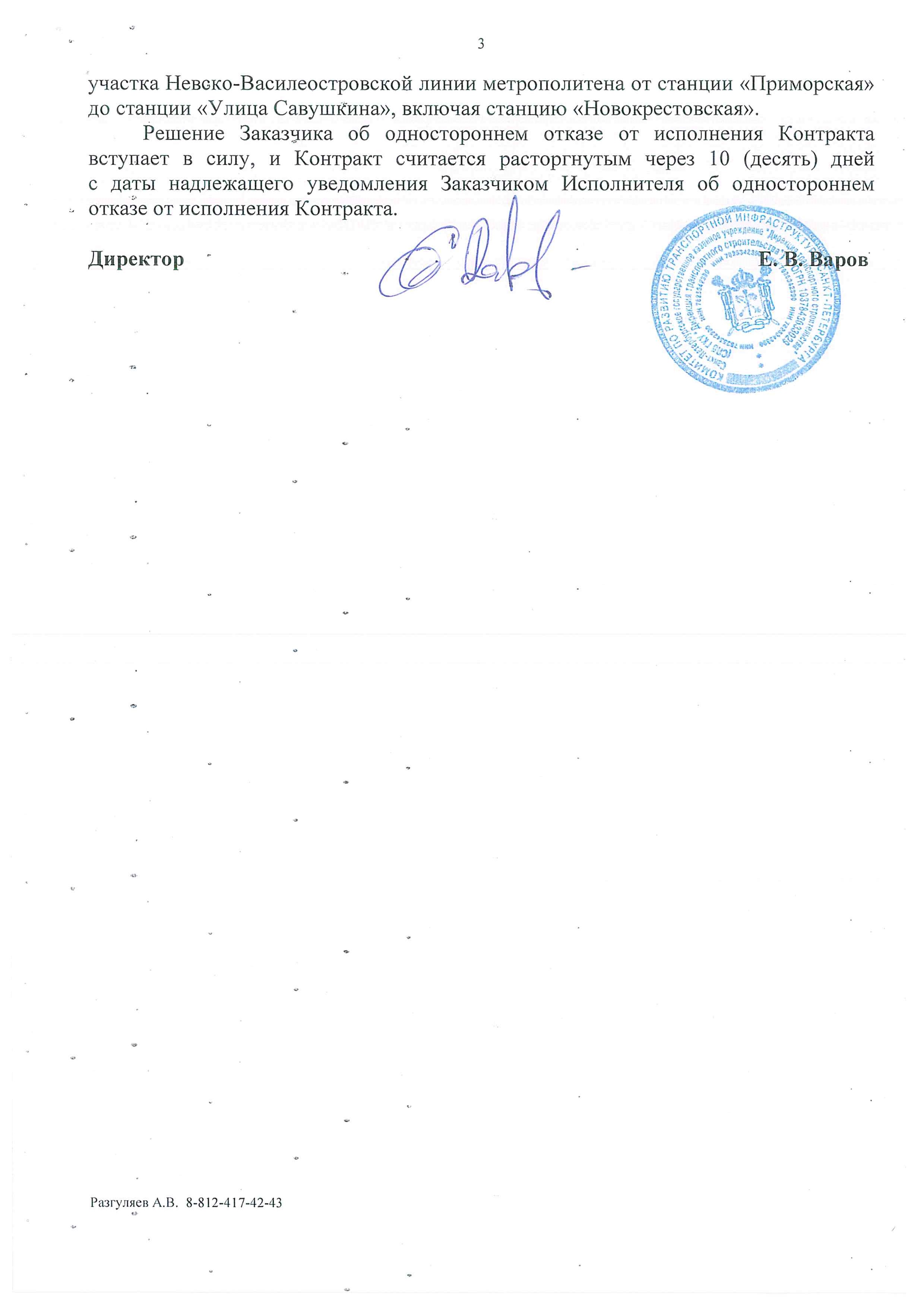 «Фонтанка» писала о том, что Смольный направил восемь писем «Метрострою» о расторжении контрактов, среди которых – соглашение на строительство оранжевой, зеленой, фиолетовой и коричневой линий. Контракт с единственным поставщиком, «Метростроем Северной столицы», предполагается подписать на днях, после совета директоров и собрания акционеров компании.