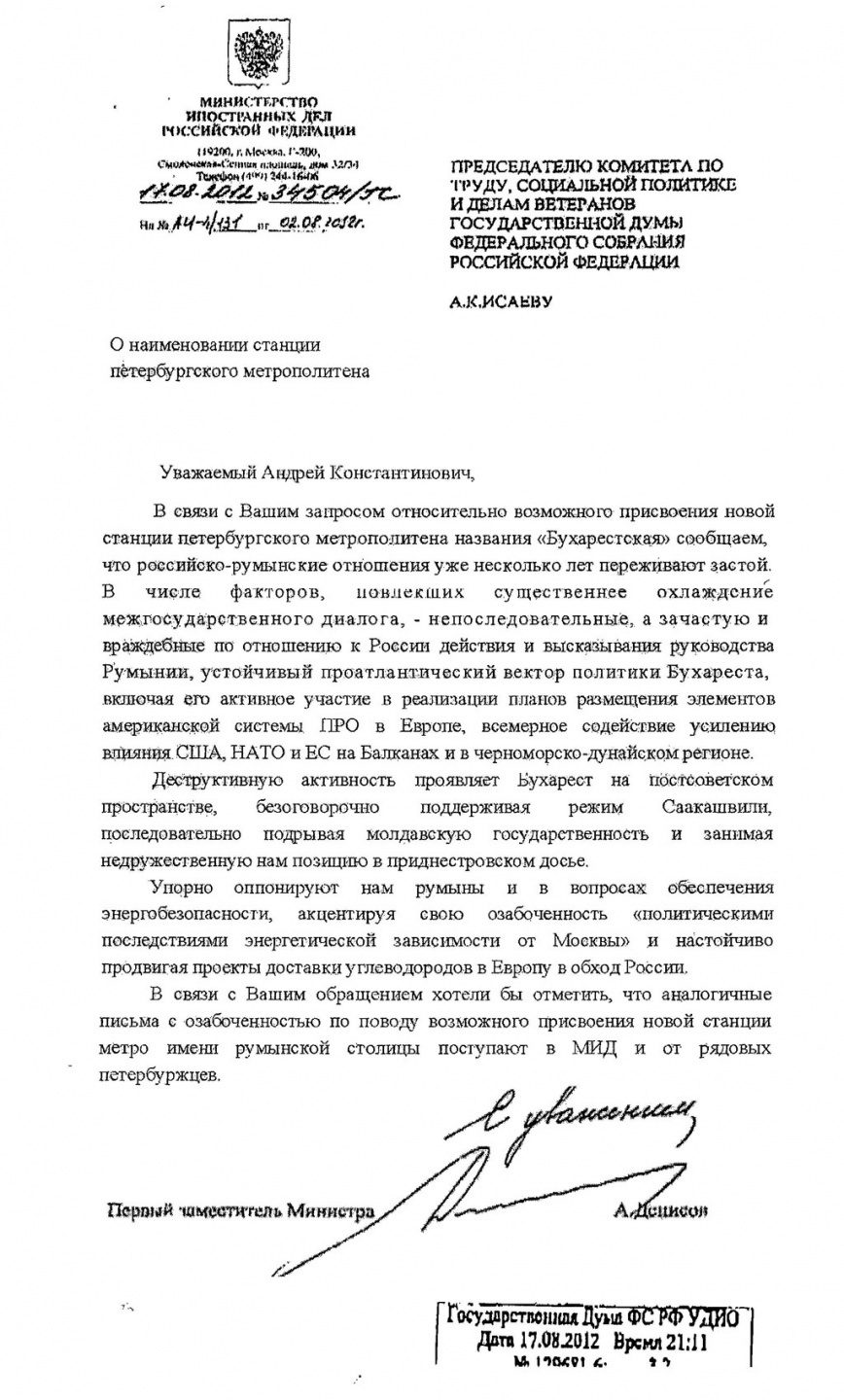 По большому счету факс, поступивший в Смольный, оказался не более чем перепиской первого заместителя министра иностранных дел Андрея Денисова и депутата Государственный думы Андрея Исаева относительно присвоения станции метро имени «Бухарестская». Дипломат пишет народному избраннику, что румынские власти позволяют себе враждебные высказывания в адрес России, поддерживают не только режим Саакашвили, но и идею размещения американского ПРО в Европе, и вообще придерживаются проатлантической политики.