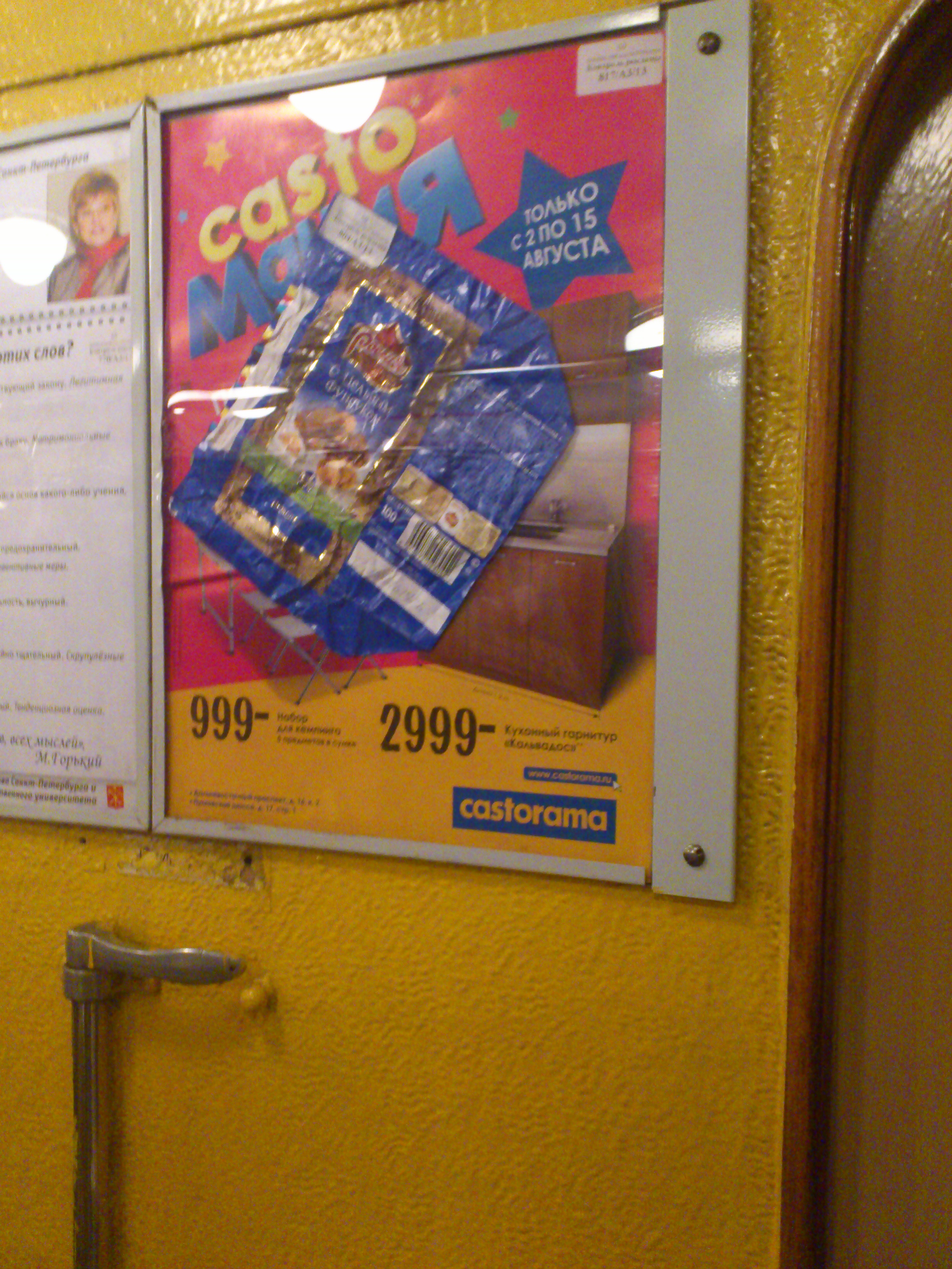 Сегодня видел забавную картину в одном из вагонов на КВЛ: схемы метро, совмещенные с рекламой, были "свернуты" таким образом, чтобы видна оставалась только схема, а реклама в верхней части спрятана от глаз (завернута внутрь). Таким образом получилась нелепая картина в виде схемы, которая не подходит под формат "кармана", не заполняя верхнюю её часть. Видимо, контракт с рекламодателем закончился. Но как же так не оказалось у рекламщиков нормальных полноформатных схем на замену? Ну, всякое конечно бывает, я понимаю