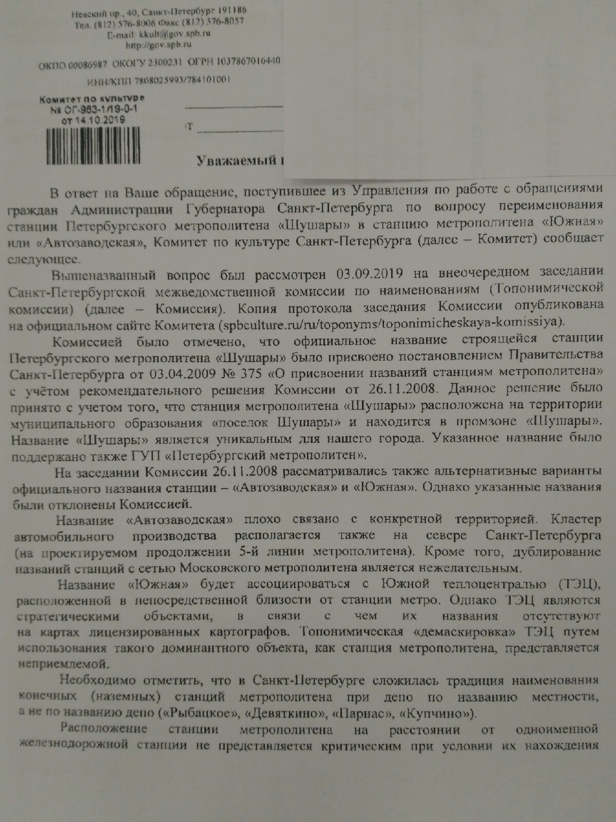Ответ из Комитета по Культуре, о нелогичности переименование станции: