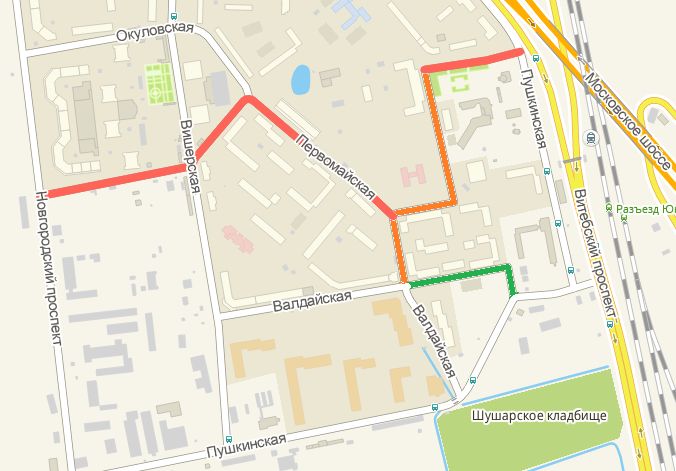 Если посмотреть на улицы в 2gis, то выясняется что например Первомайская улица - кривая и разорванная каким-то немыслимым образом. Там же есть какие-то безымянные улицы (вот где работа для Randy), тоже кстати кривые. Цветом выделены безымянные улицы, также обратите внимание на немыслимую кривизну именованных улиц: