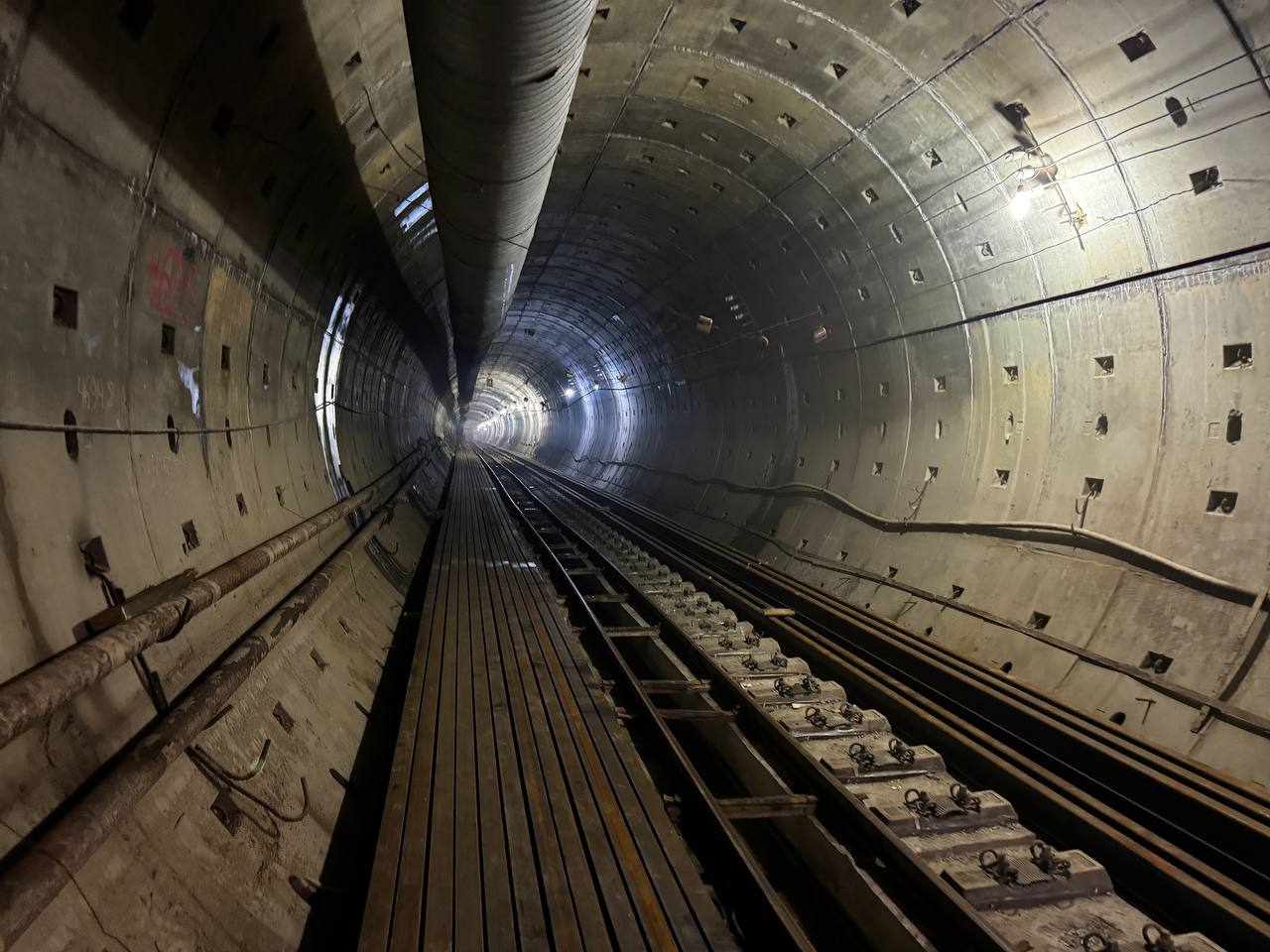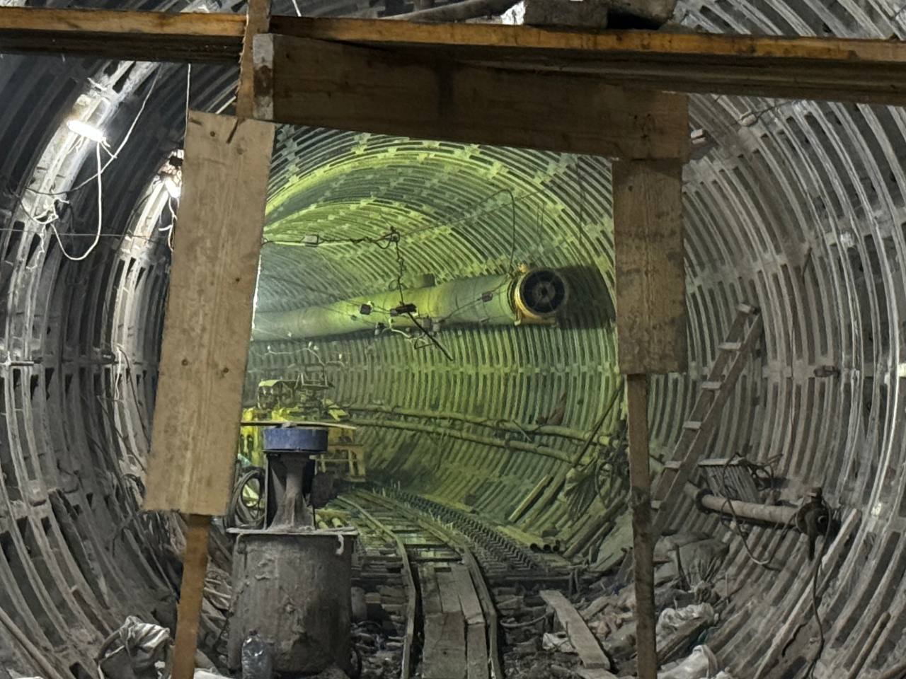 Левый перегонный тоннель. Чугунная прокладка между кольцами указывает, что щит сооружает тоннель в кривой.