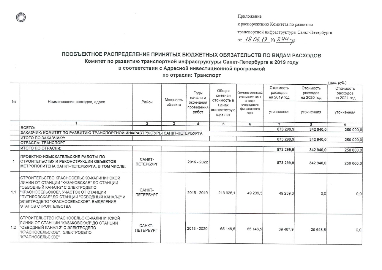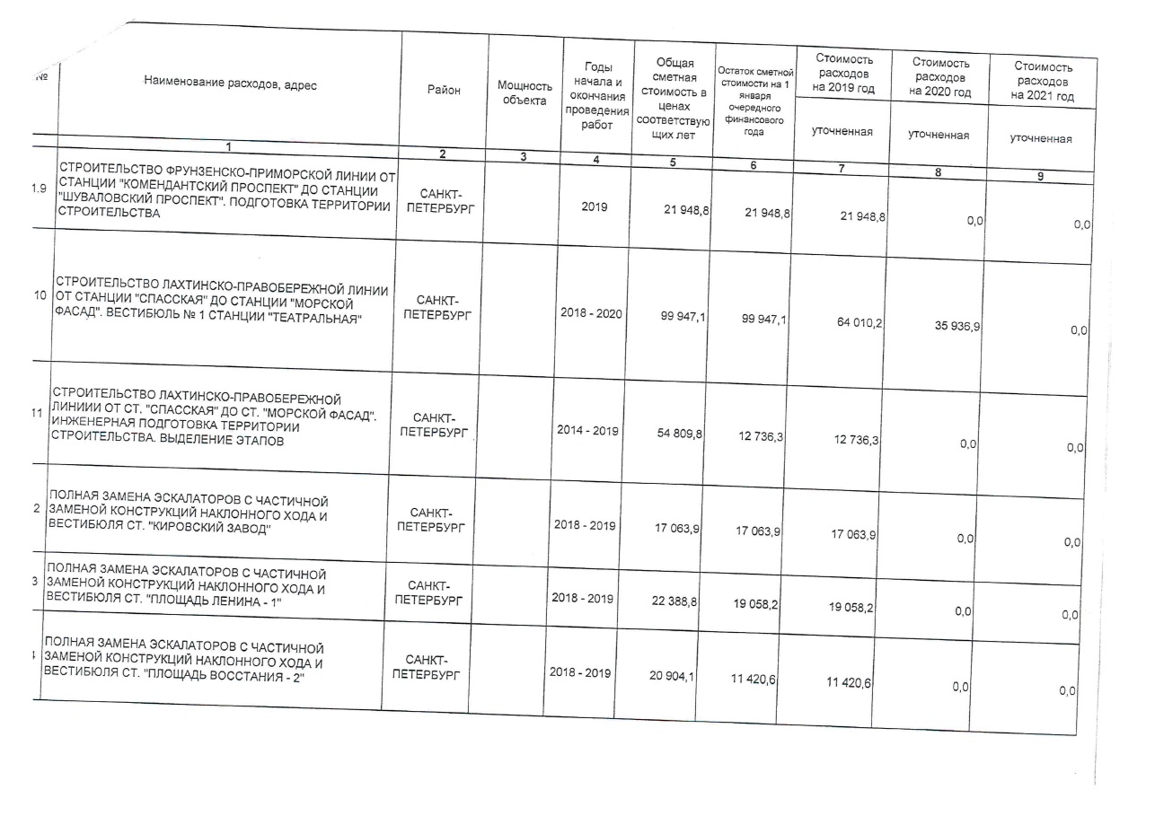 - уменьшено финансирование в 2019 году строительства участка "Спасская"-"Большой пр." 6,402 до 4,641 млрд. руб.;