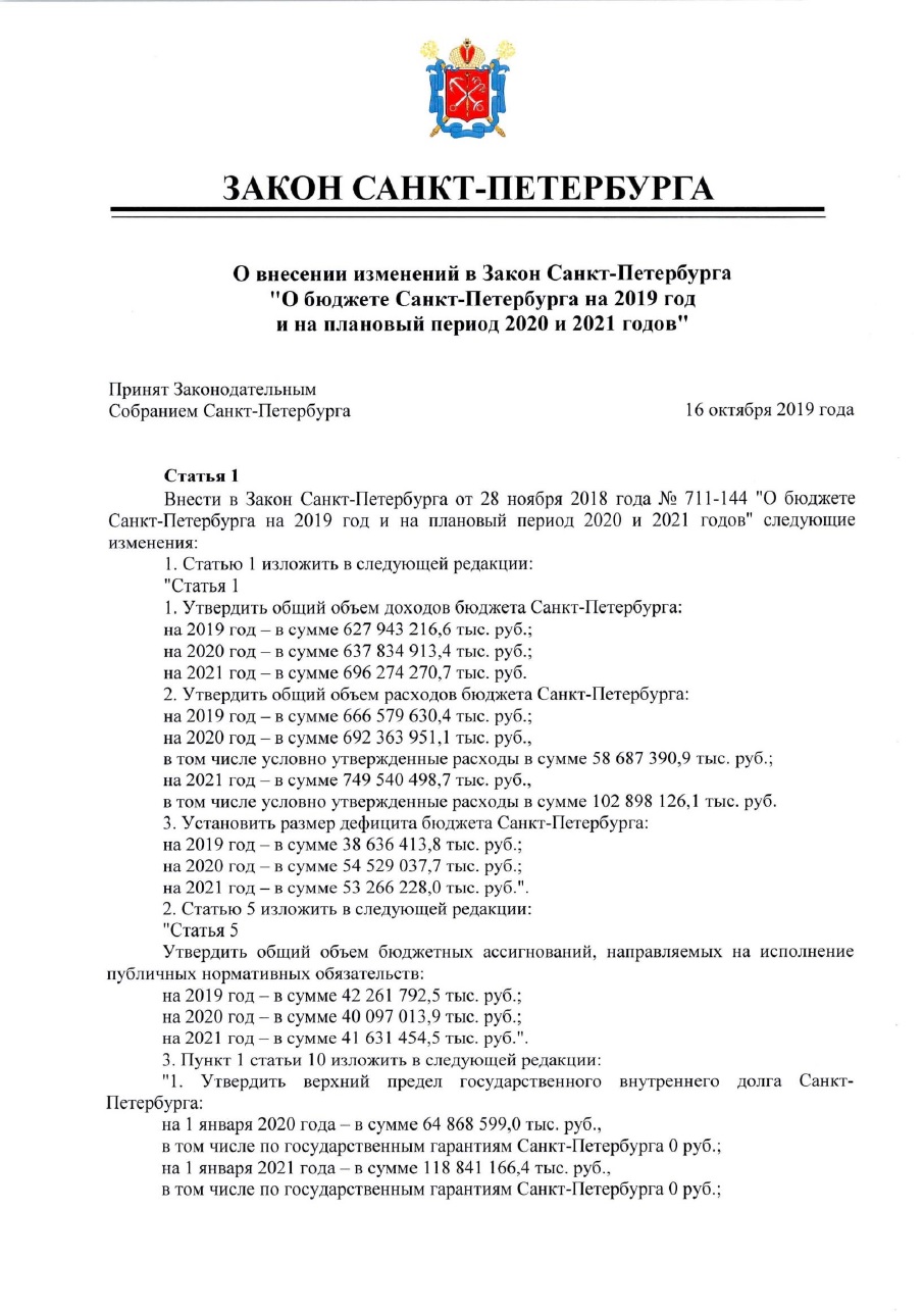 Правительство Петербурга одобрило изменения в бюджете 2019 года. Дефицит составит 40,8 млрд рублей.
