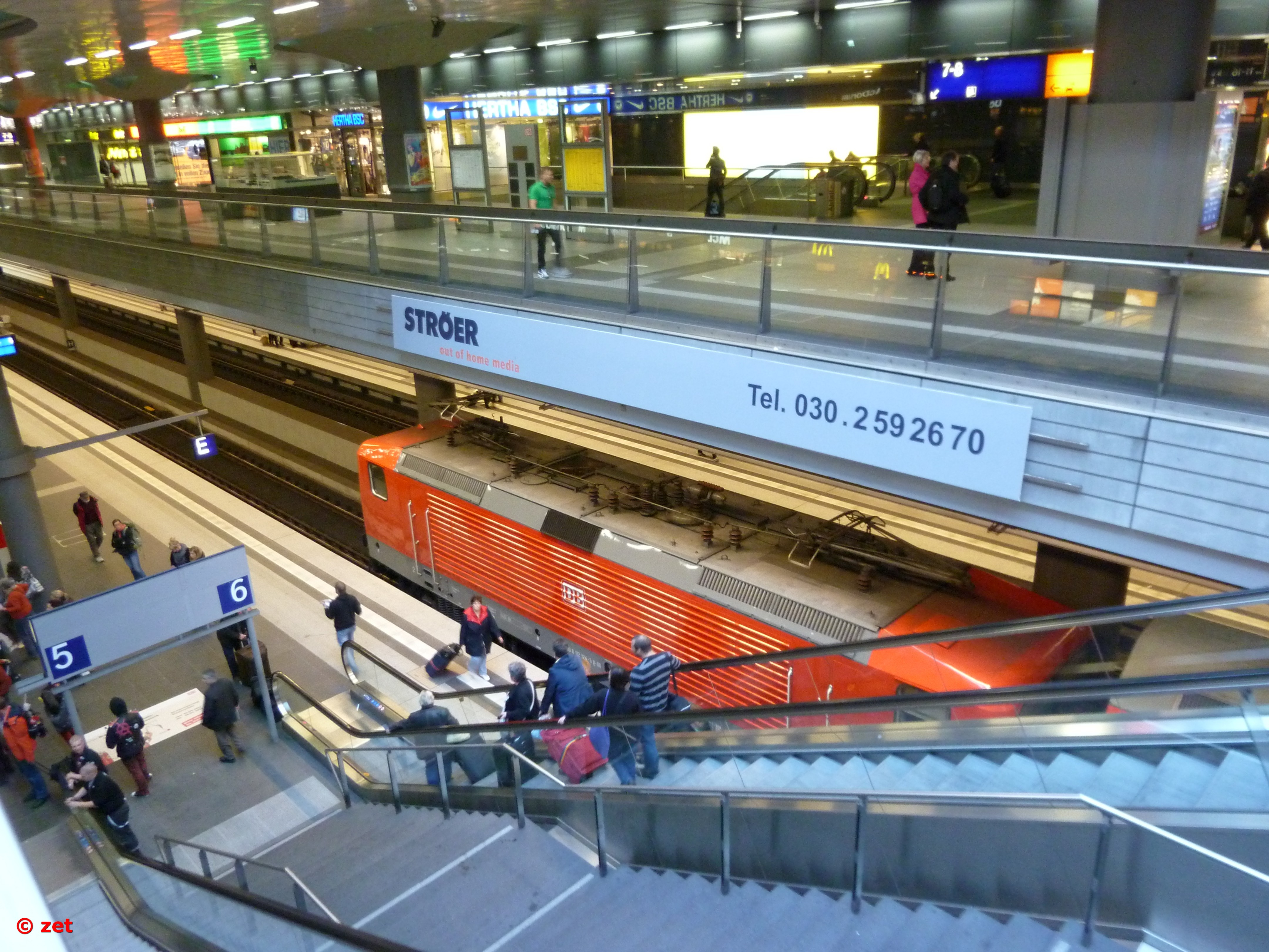 На платформе вокзала Berlin Hauptbahnhof. Эскалаторы и лестницы для передвижения между уровнями