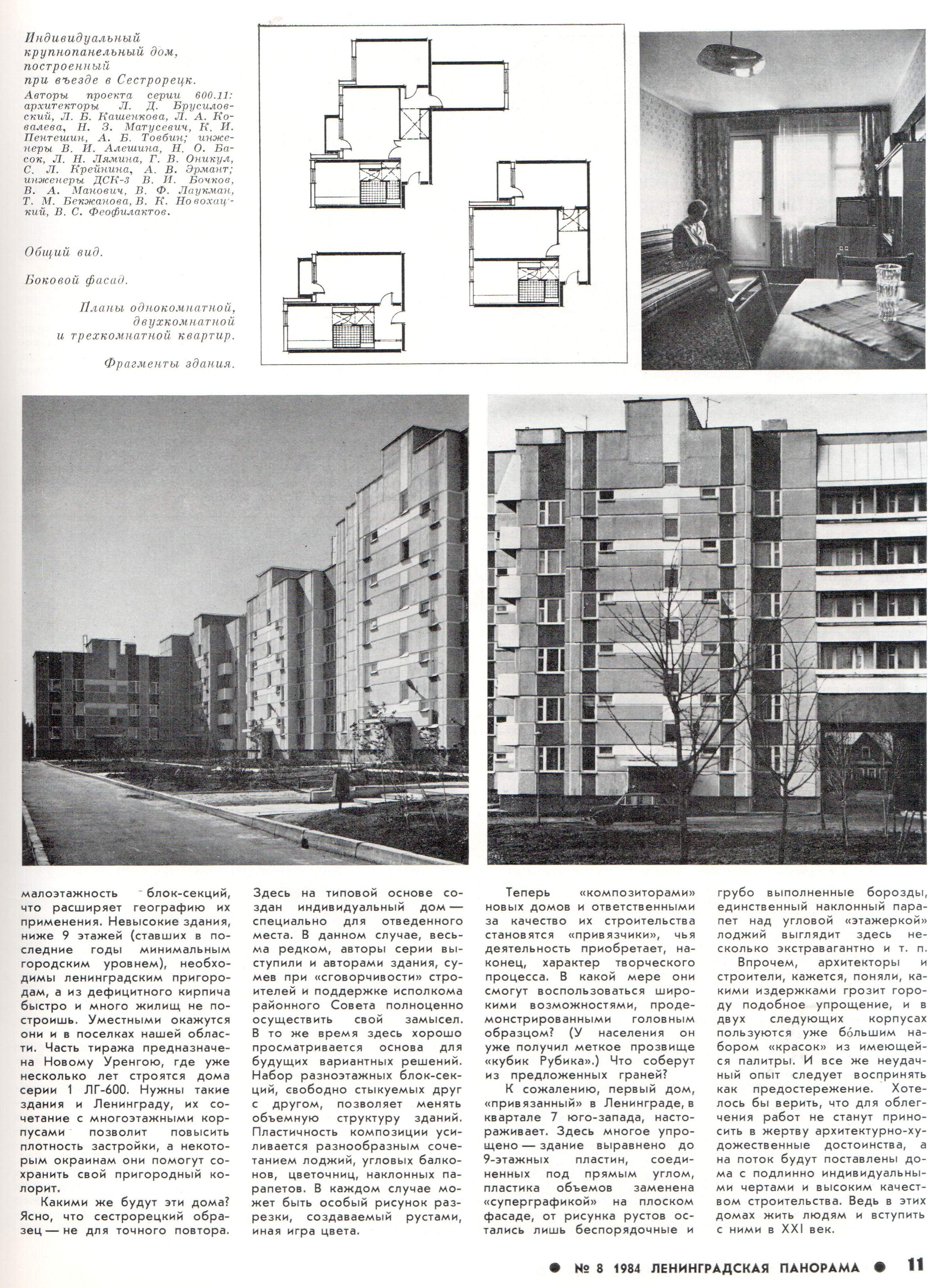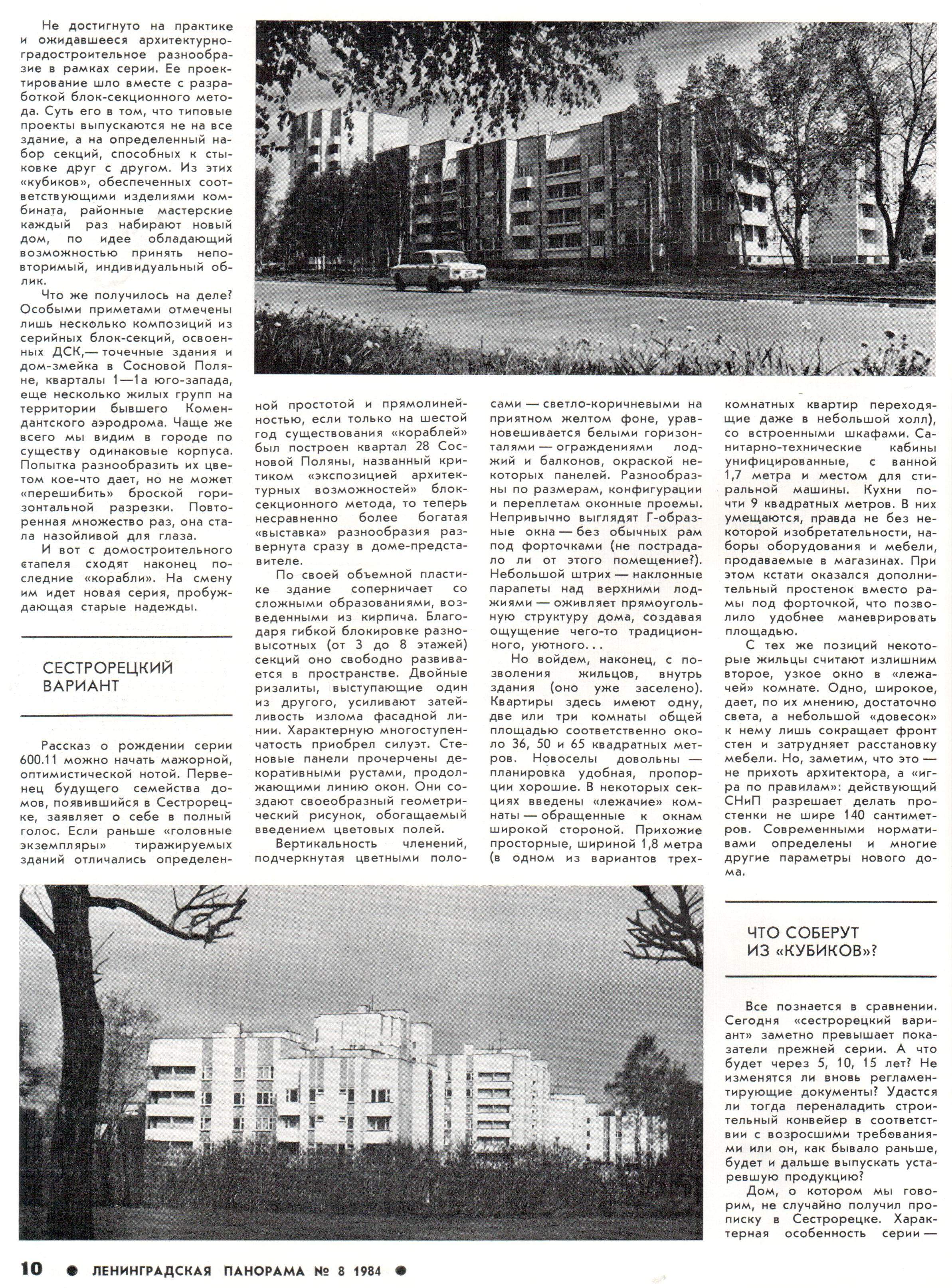 не знал что первый дом этой серии был построен в Сестрорецке. Только интересно в каком году...журнал за 84-й, но думаю там говорится о чуть более раннем времени. Например что кухни в 1-Лг600а увеличились 5 лет назад. т.е. в 79-м...но 1-Лг600а/70 строили с середины 70-х годов...