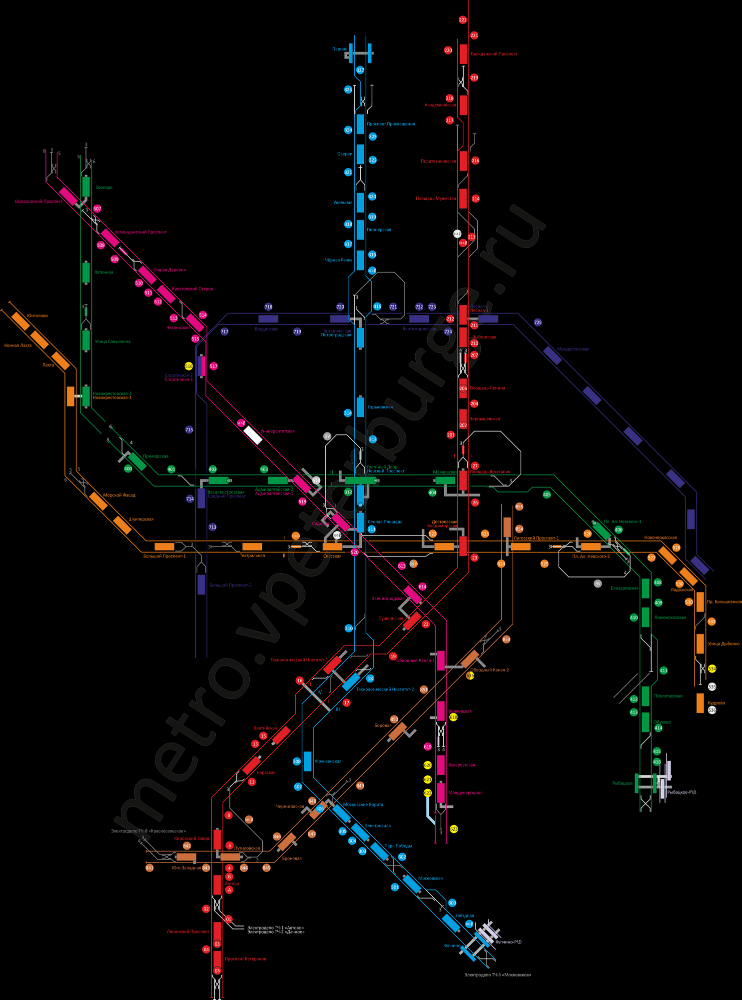 И вообще, не очень понятно, какие съезды действующие, а какие - разобранные. Так за Парком Победы съезд тёмно-серый, видимо разобранный. Но тогда почему всё путевое развитие Академической тёмно-серое (хотя по ней регулярно оборачиваются поезда), а на Техноложке наоборот - всё светло-серое?