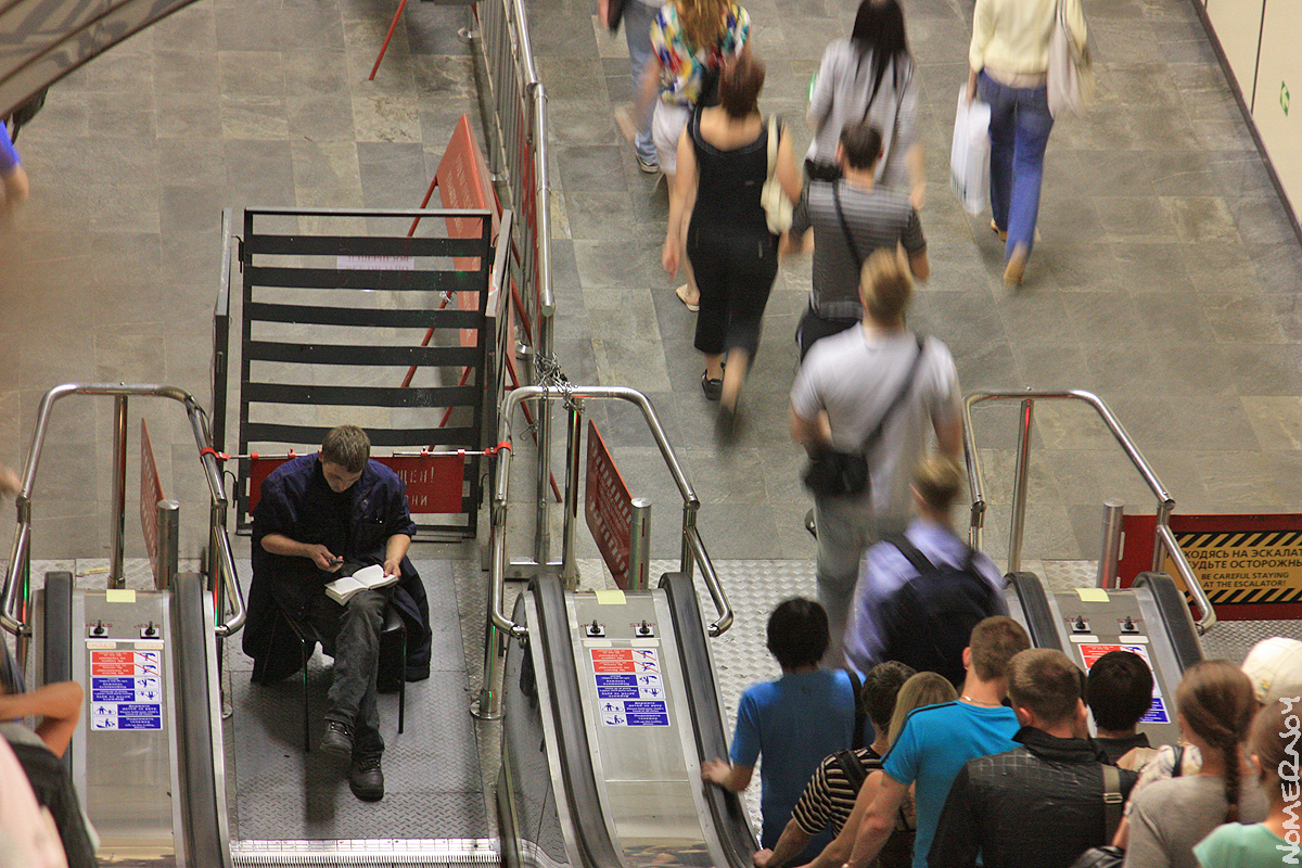 в 10 утра наблюдал 3 работников уневерсалмаша вглядваювающихся в мехнизм экскалатора двигающегося с ремонтной скоростью.