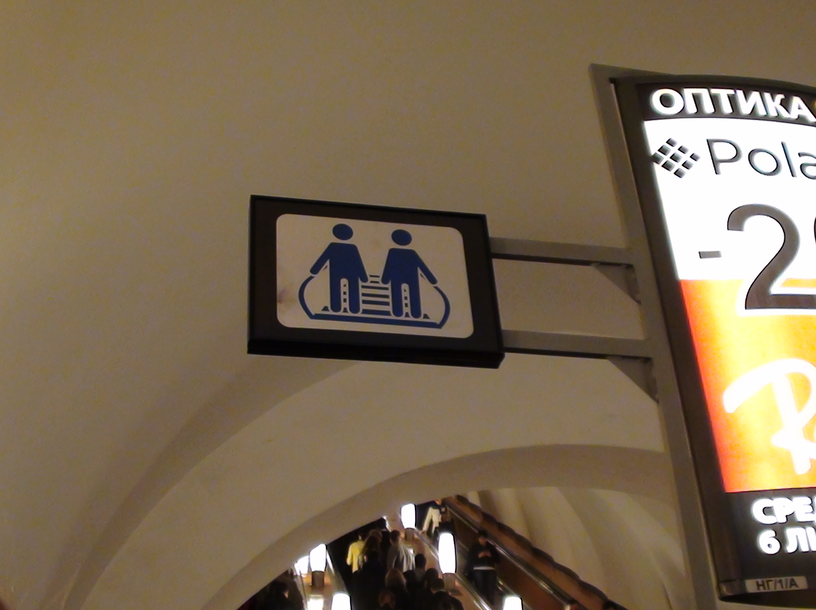 Внизу, на Ваське уже где-то пол года висит странный знак (стоять по двое человек???). Если так, то интересно, зачем? Народ не обращает внимания на знаки, тем более не следует им на такой станции как Василеостровская. С утра всегда мясо, после открытия дверей вагона, все в рассыпную бегут к эскалатору, всем пофиг на знаки.