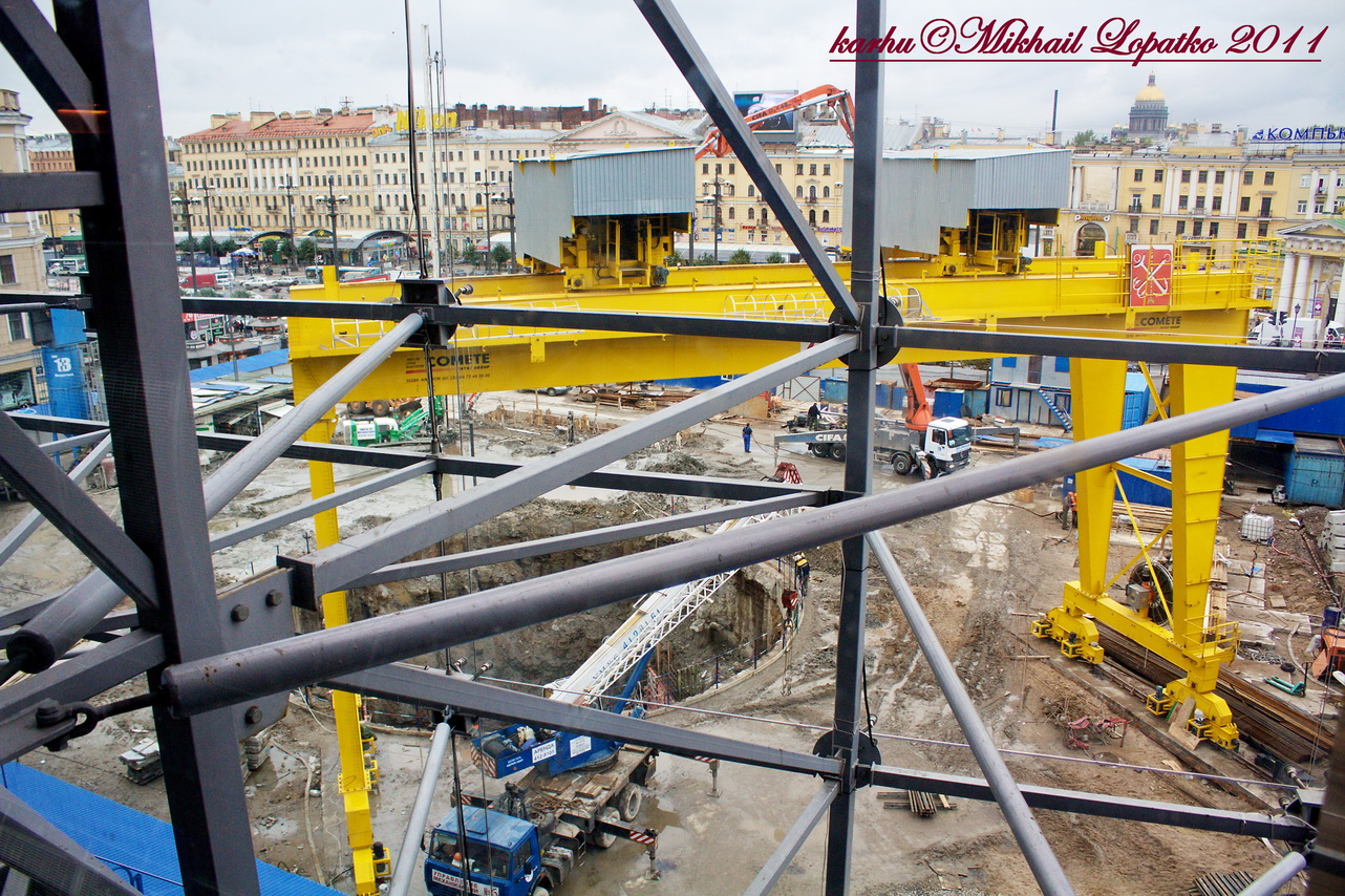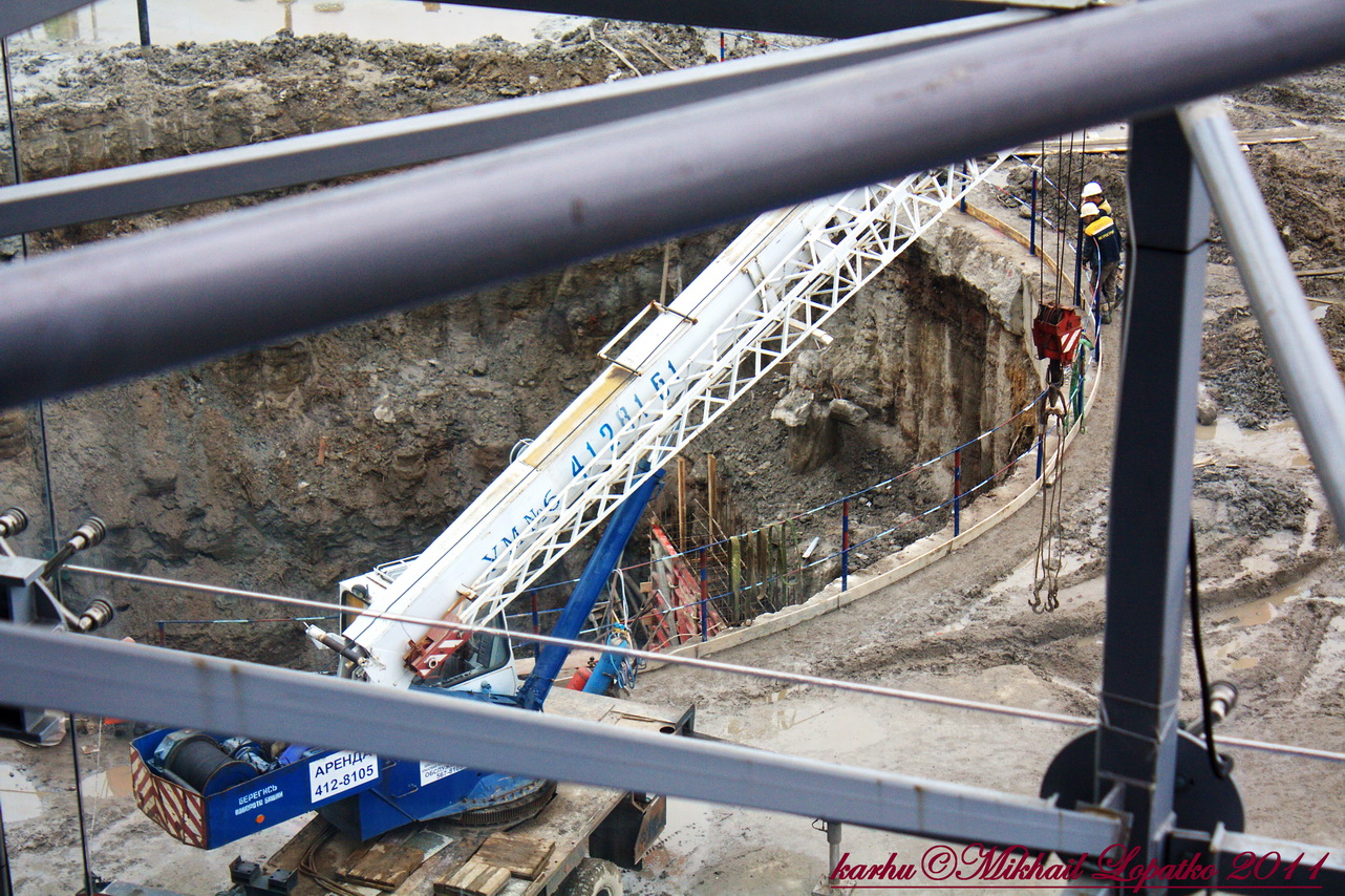 Посмотрел сегодня, что нового на стройплощадке - ведется укладка бетонных плит покрытия, рельсы для крана, насколько мог видеть, полностью уложены, по самому крану - проложили толстые черные кабели, вероятно, для питания лебедок. Когда там ожидается прибытие щита?