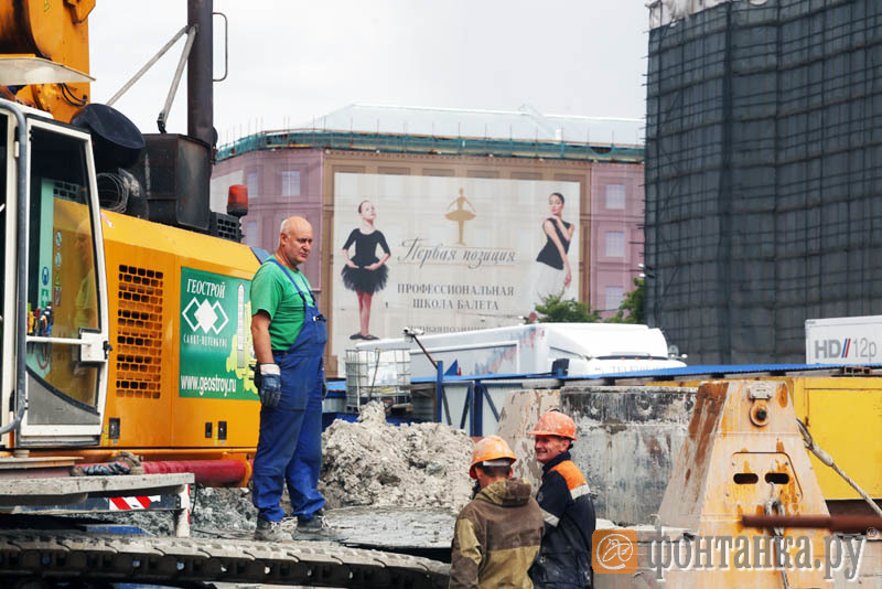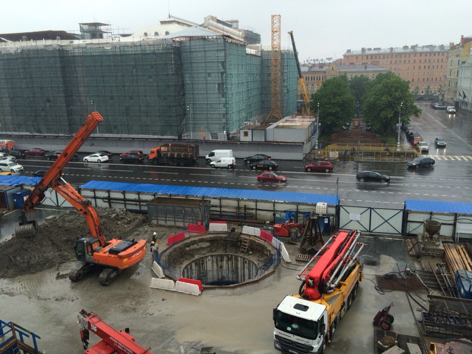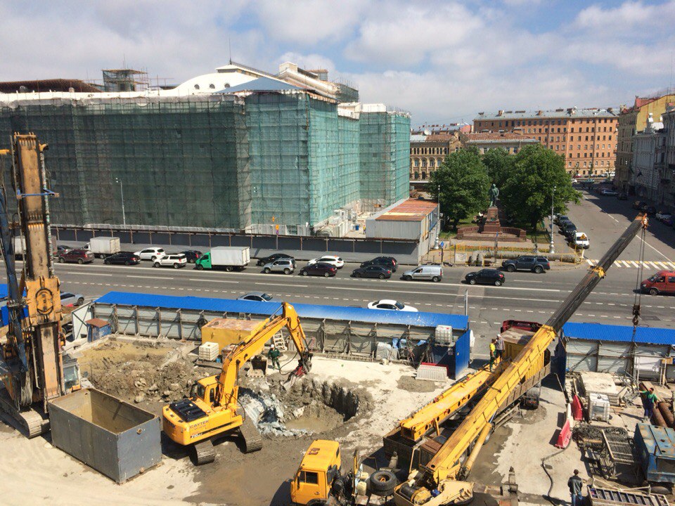 Сейчас стройплощадка «Метростроя» занимает узкий пятачок между улицей Союза Печатников и улицей Глинки, вплотную примыкая к зданию Мариинского театра.