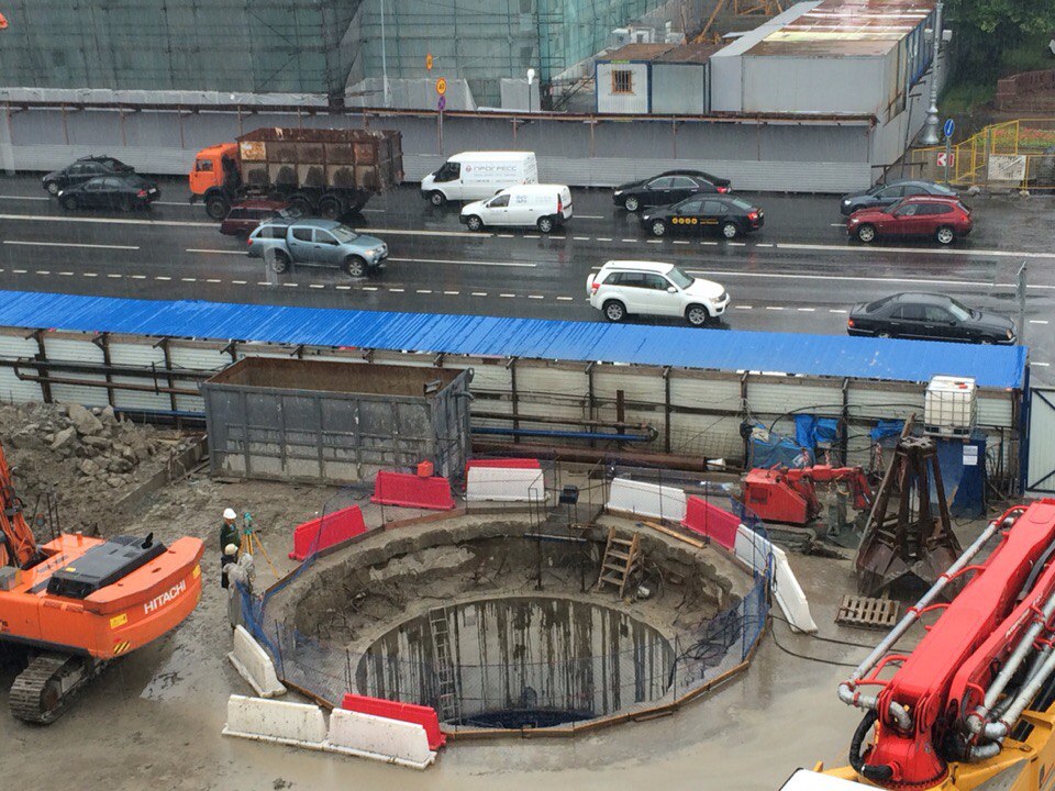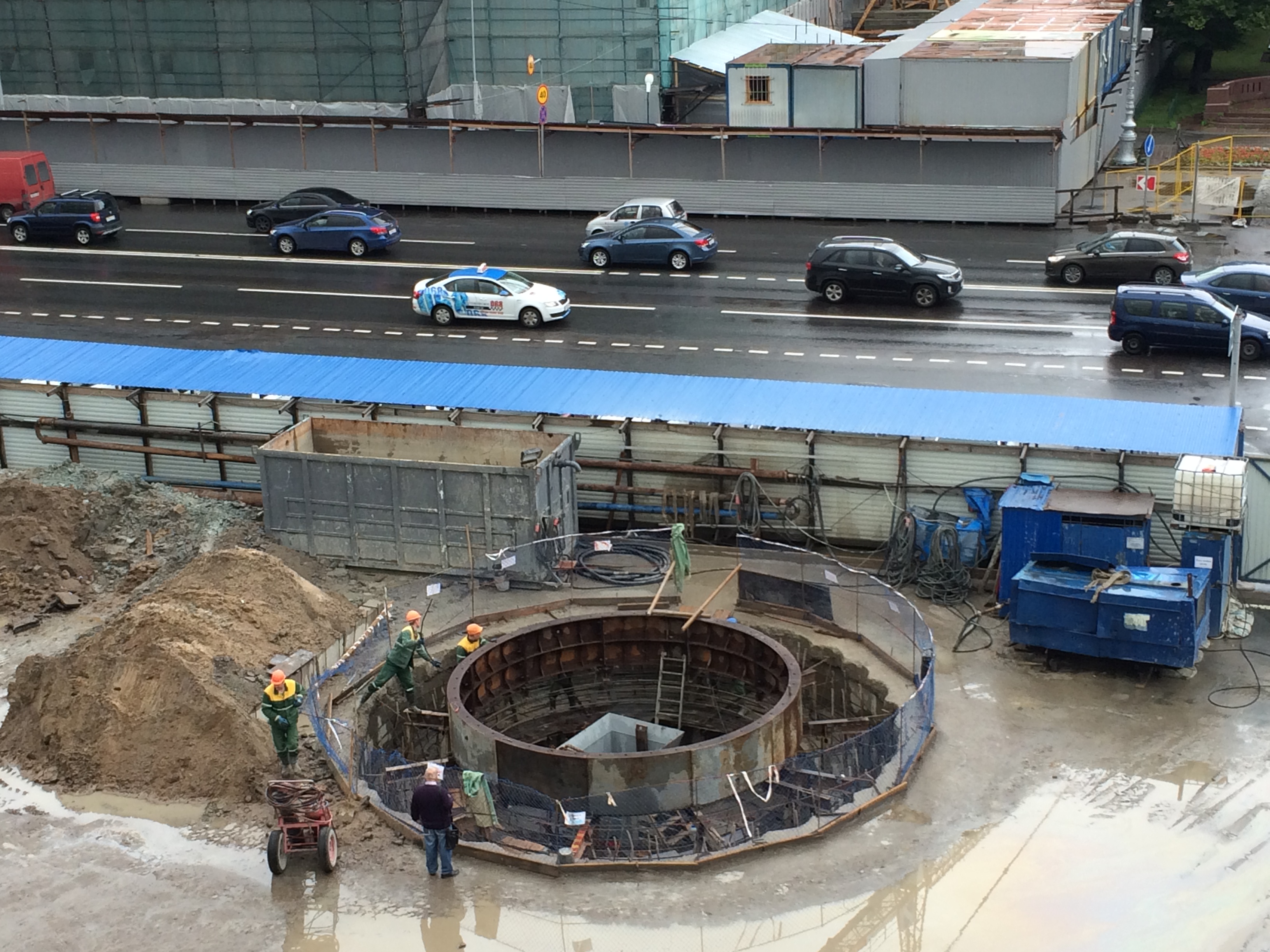 Устройство контура выполняется методом буросекущих свай - в грунте бурят скважины, в которые потом погружают армированные конструкции, и заливают бетоном. Таким образом уже закреплены 25 из 32 свай, осталось 7. После выемки грунта и укрепления стены шахта будет готова.