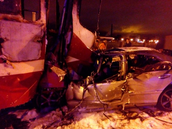 Как сообщает сайт МЧС, о ДТП сообщили около половины первого ночи 11 декабря. На проспекте Обуховской Обороны у дома 139 в трамвай № 7 въехал "Мерседес". В результате автомобиль и трамвай вспыхнули; как говорят свидетели происшествия в группе "ДТП и ЧП", в автомобиле был газовый баллон. Трамвай, к счастью, ехал без пассажиров, водителя трамвая смогли освободить вовремя (дверь заклинило, говорят очевидцы). Он не пострадал.