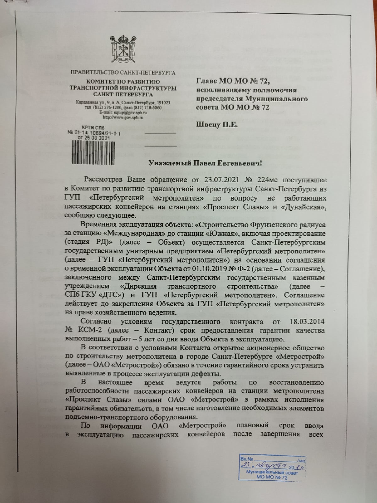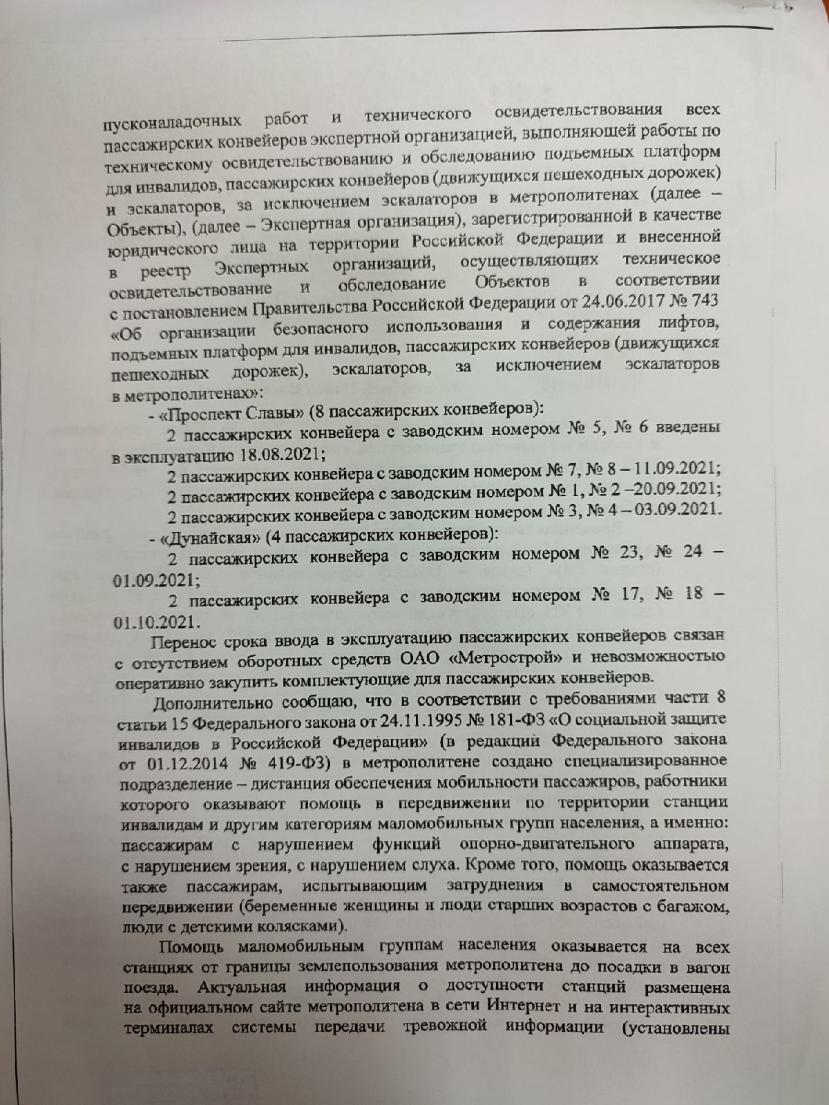 Все траволаторы на станциях метро Дунайская и Проспект Славы должны заработать к 1 октября. Новый ответ КРТИ)))