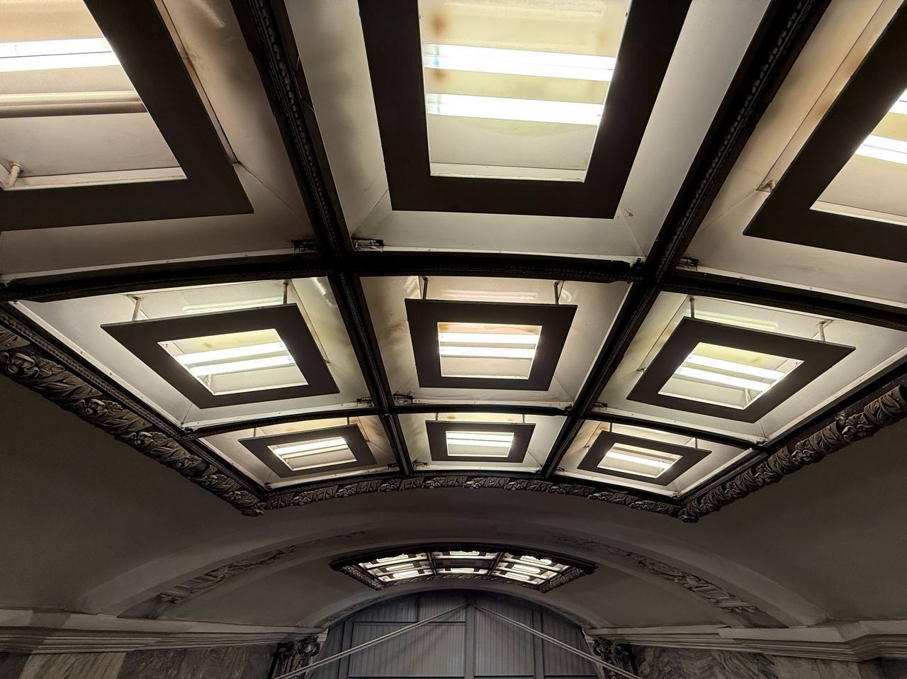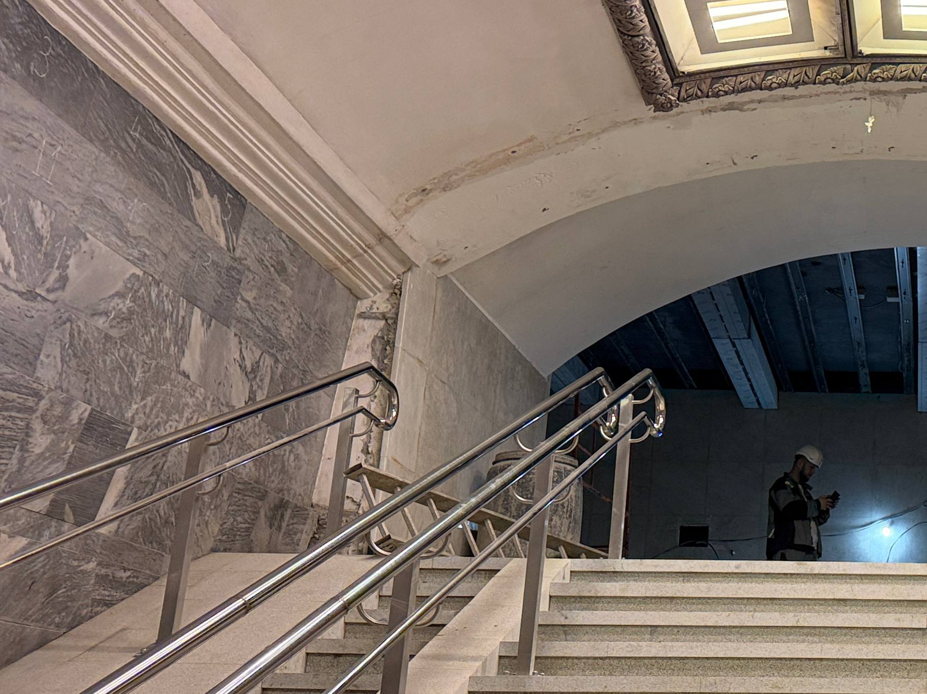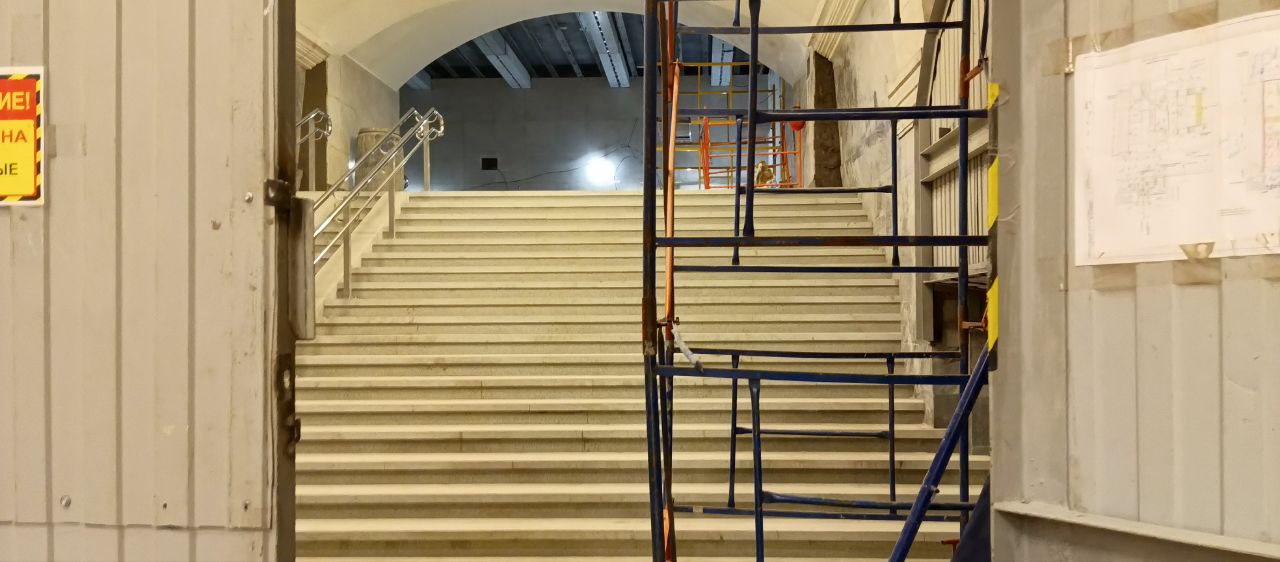 Ранее были выполнены следующие работы: демонтированы арка и часть торцевой стены, а также возведены внутренние конструкции — забетонированы плита перекрытия и лестничный марш для спуска на станцию.