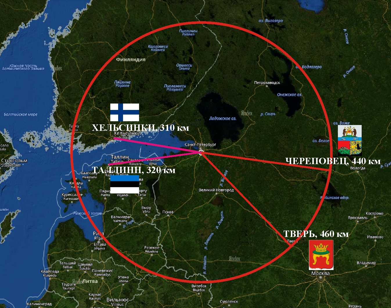 Здесь привожу аналогичный радар на трамваи. С трамваями несколько дальше. И затрагивает две страны в близости до 400 км: Хельсинки (Финляндия), 310 км и Таллин (Эстония) 320 км. Из РФ - Тверь 460 км и Череповец 440 км.