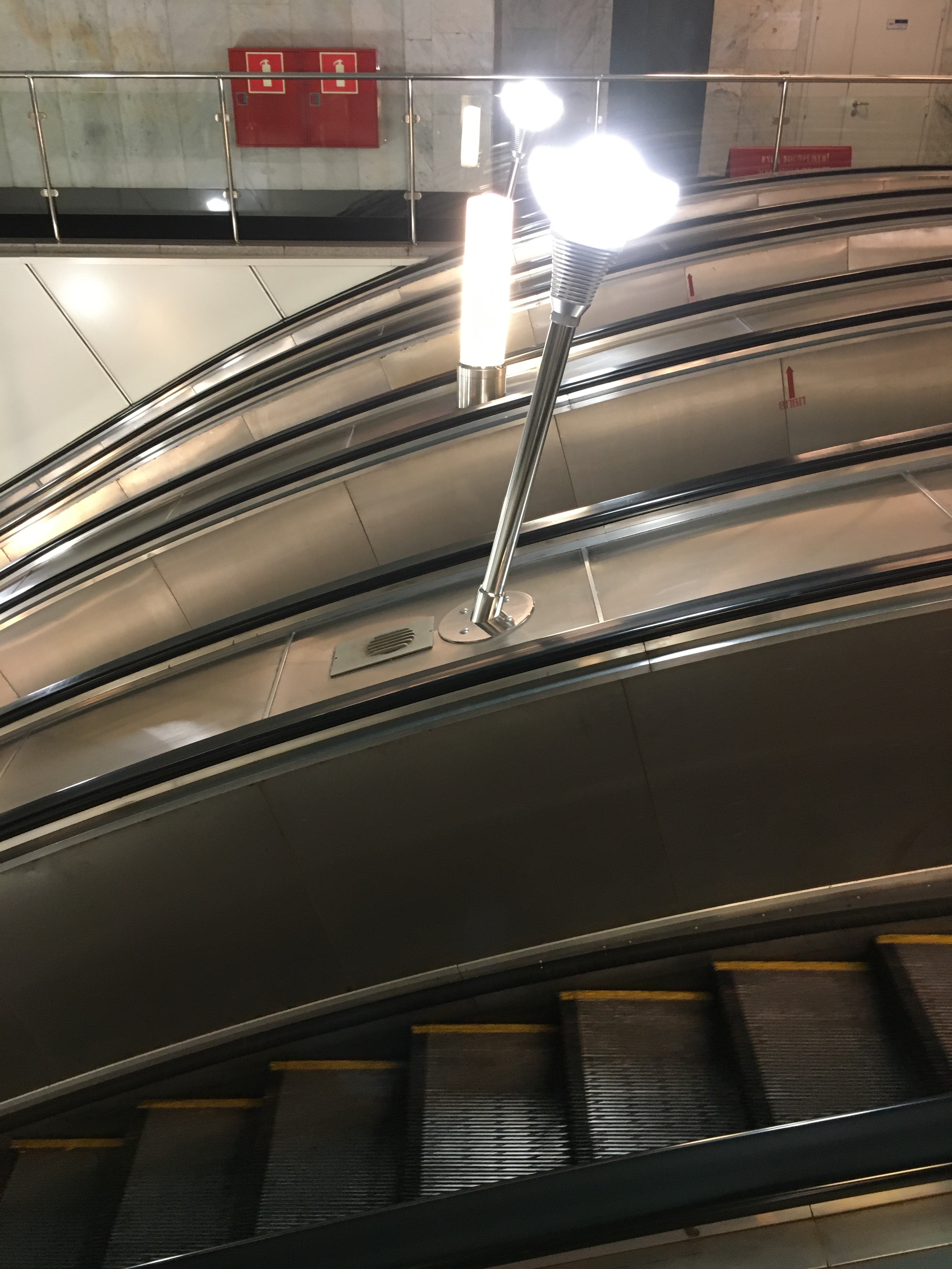 Почему то поставить ровно крайние к турникетам факелы не получилось. Видимо крепление не рассчитано на разный угол наклона балюстрады. Вопрос в другом, а нахрена там вообще светильники если есть освещение в вестибюле?